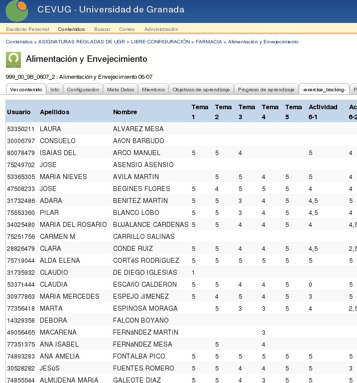 - Arturo has programmed such a table (alternative view) with exercise and tests marks (all exercises and tests that are inside a course, at any folder/level).