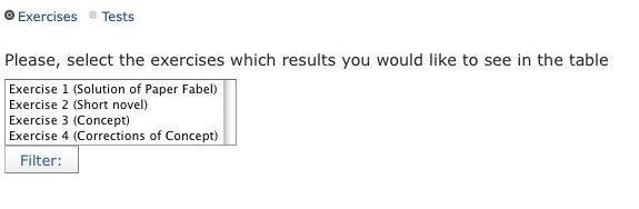 - Cause of the scalability-problem (number of exercises and tests increases), Arturo additionally added a filter, so that teachers can select which exercises to be shown in the table.
