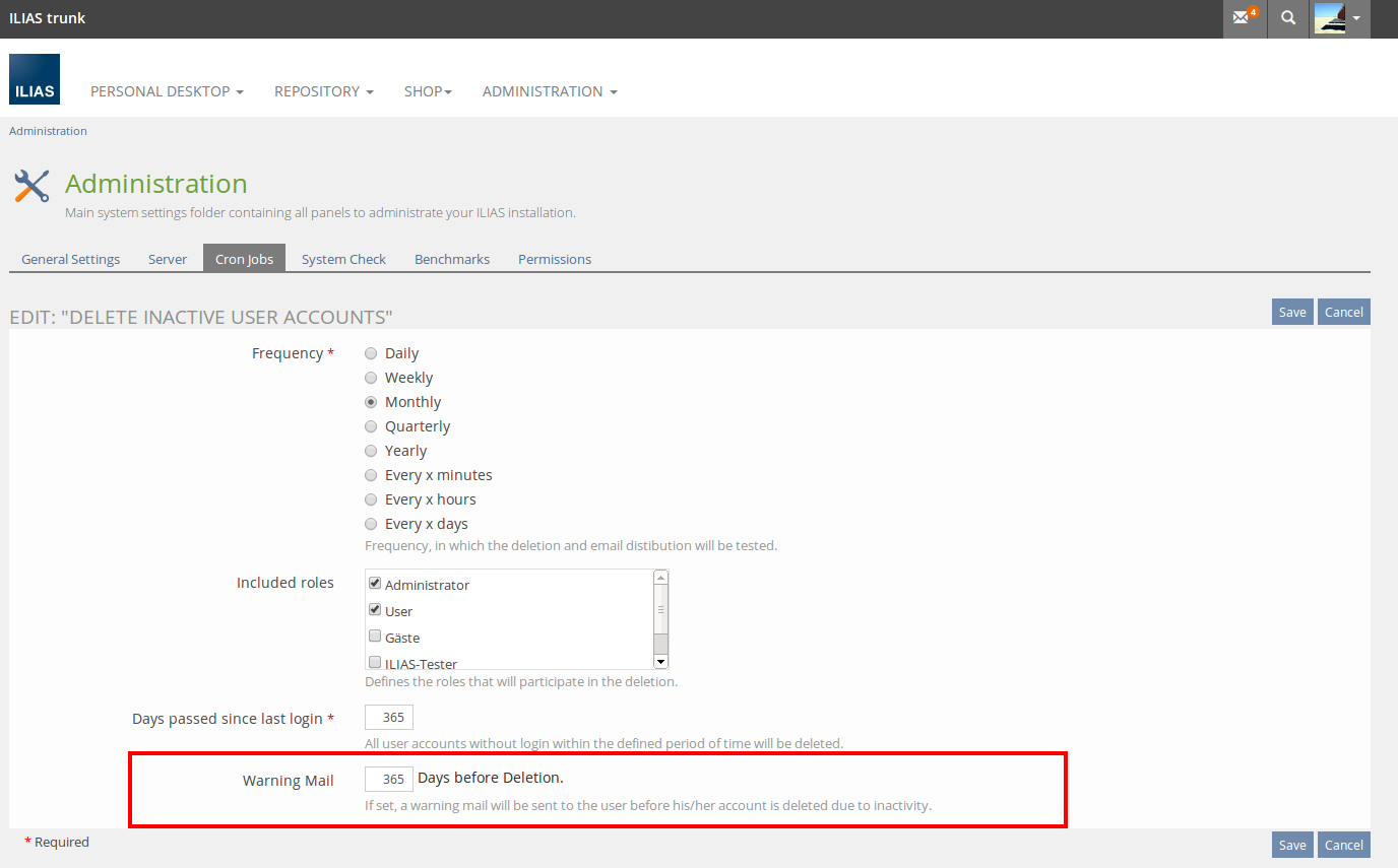 - The option "Earliest date in days for sending a reminder mail" should be named "Warning Mail". It should get a suffix "Days before Deletion". The info text should be: "If set, a warning mail will be sent to the user before his/her account is deleted due to inactivity."