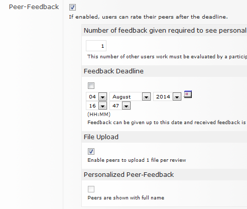 As far as I can see, up to now taking part in the peer feedback does not affect the passing status of the course members fpr the execise unit. While this was not crucial for the anonymous mode, I does make a lot of sense to actually have this in the personalized mode. Here instructors hsould be able to see, who has taken part and who hasn't, since the task is part of the assignment. Anyway, users at the University of Freiburg have even asked for the peer feedback to be obligatory in the anonymous mode.