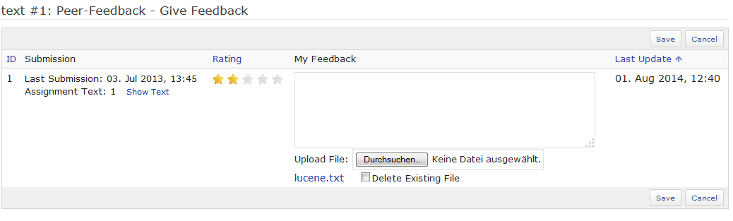 It should be possible to upload a file as a peer feedback in addition to the text and rating. Especially when the hand-in solution has been a file, this might come in very handy (programming tasks, corrected / annotated version of a document, ...).