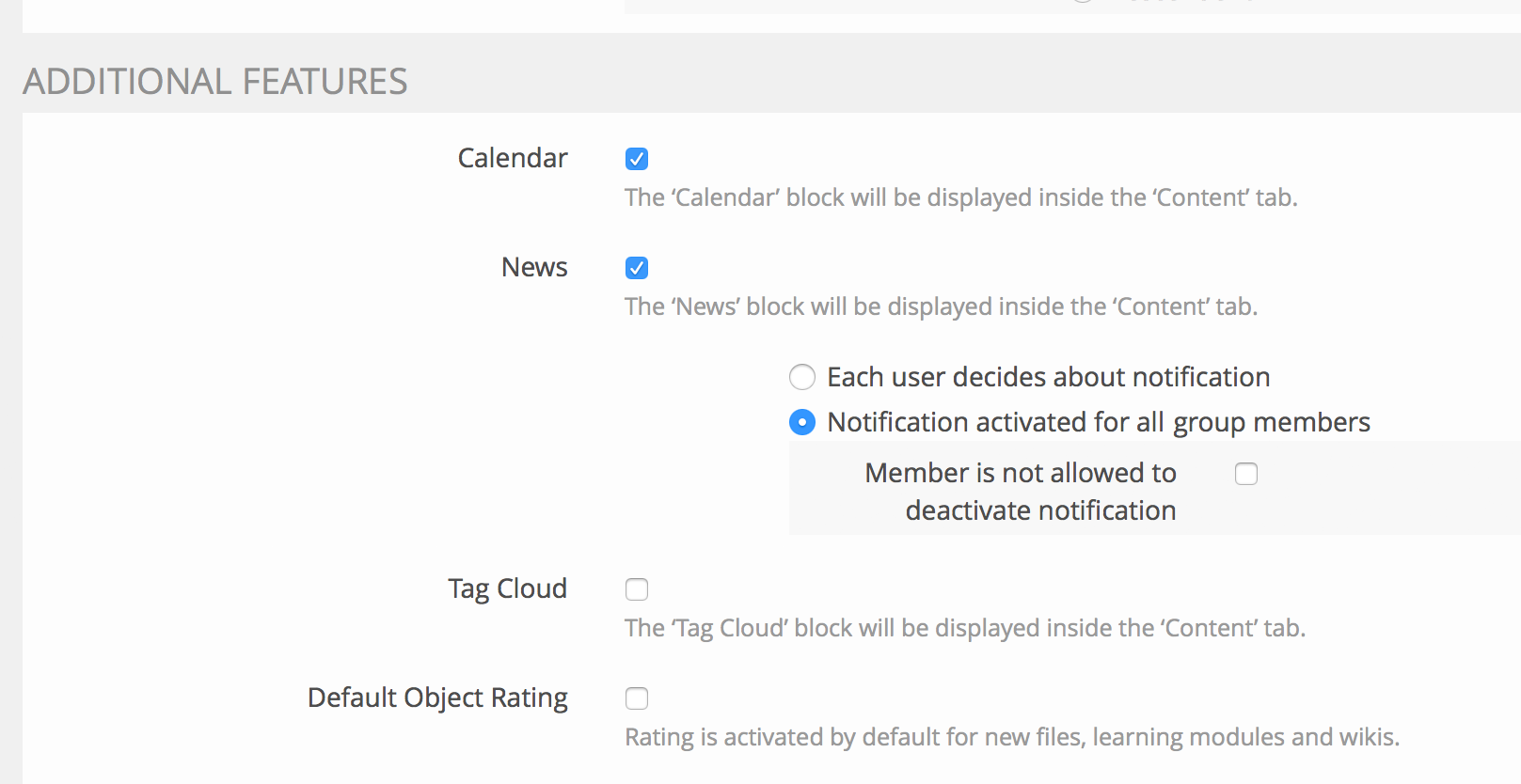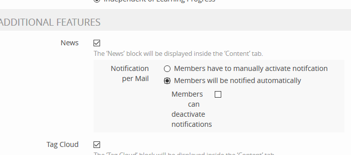 - IMHO we do not need a dedicated checkbox to activate the news notification. Once ‘News’ is activated, the news notification feature is available as well. Default setting (for a new group / course) would be "Each user..." - which means ‘Notification is disabled by default and has to be enabled by each user individually’.