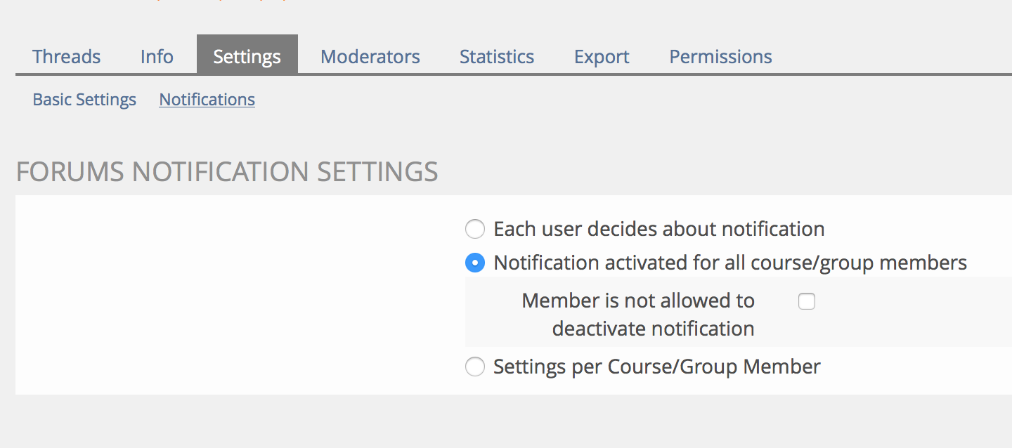If a forum is embedded in a group or course, a new sub-tab is presented in the Settings-tab: Notifications.