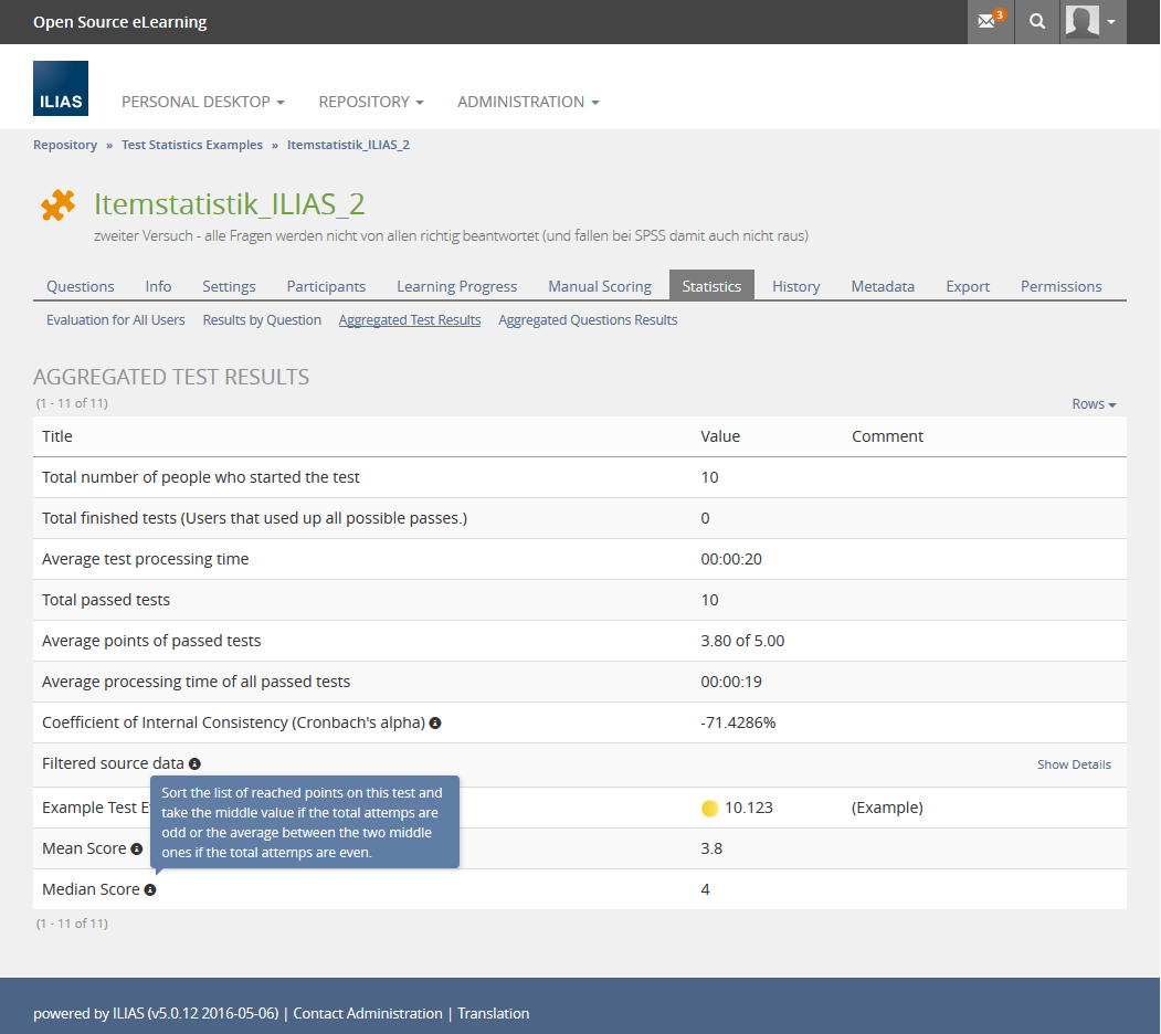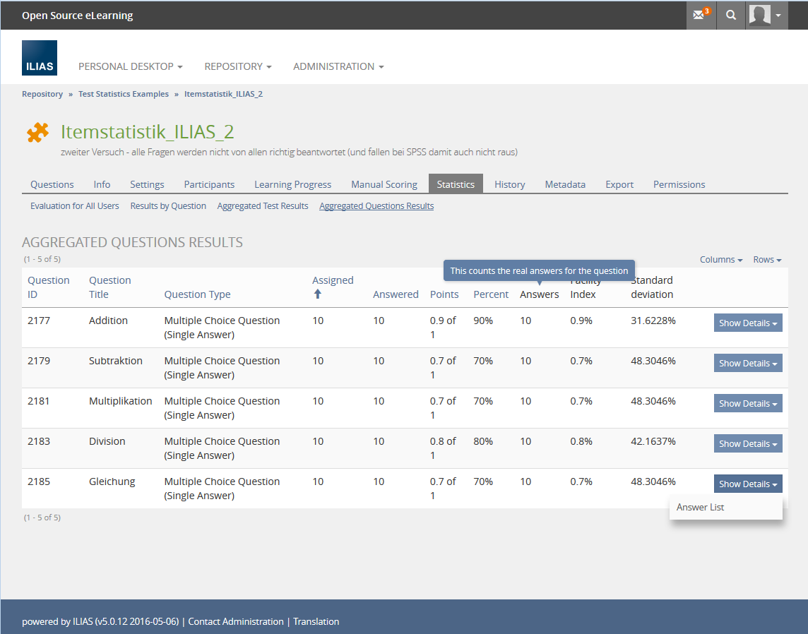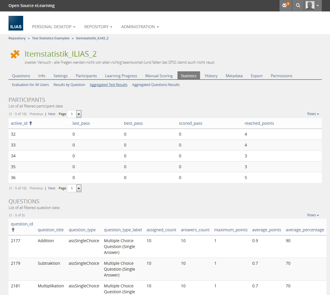 This feature request is related to Extended Test and Item Statistics and uses similar extensions to the aggregated test results screen. It is also related to Statistics: Evaluation for all questions which can use the extended aggregated results instead of adding a new sub tab “Evaluation for all questions”.