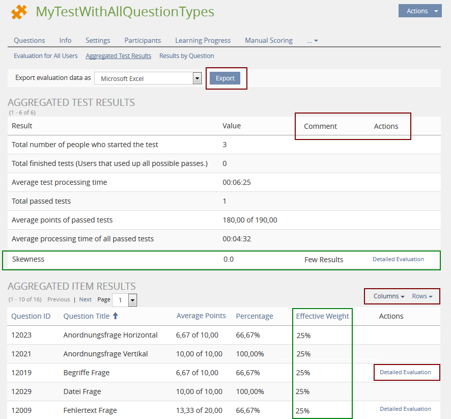 The aggregated test results screen will be extended by the calculations that fit to the test and its questions (extended/changed functionality is framed in red, examples from an imaginary plugin are framed in green):