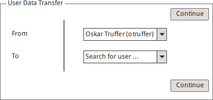 In the user administration (Administration -> User Administration) a new toolbar button is introduced: "Transfer User Data". By clicking this button we get to a selection, where the user can select from and to what user data should be transfered. This interface will be similar to the user administration table in order for the user to be familiar with the search (see screenshots).