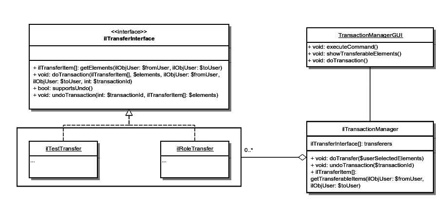 interface ilTransferInterface {/*** Returns a list of transferable items. Important: The user can make a selection, not all will be transfered* @param $fromUser ilUser* @param $toUser ilUser* @return ilTransferItem[]**/public function getElements(ilUser $fromUser, ilUser $toUser);/*** Moves the item specified in $items from one user to another.* @param $items ilTransferItem[]* @param $fromUser ilUser* @param $toUser ilUser* @param $transactionId int The transaction Id will be used if the user wants to undo the transaction.* @throws ilTransferItemsException**/public function doTransaction(array $items, ilUser $fromUser, ilUser $toUser, $transactionId);/*** @return bool returns true iff you offer a undo functionality of a tranaction.**/public function supportsUndo();/*** @param $transactionId int* @param $elements ilTransferItems[] The original set of elements that was given to the transaction call.**/public function undoTransaction($transactionId, array $elements);}class ilTransferItem {protected $id;protected $title; //used for element displayprotected $info //used for element displayprotected $type; //used for icon displayprotected $additionalParameters; //Custom parameters.// [Getters und Setters]}class ilTransferException extends ilException {protected $userFeedback;/*** @message string The usual message for an exception* @userFeedback string Is used for a summary for the enduser.**/public function __construct($message, $userFeedback);}