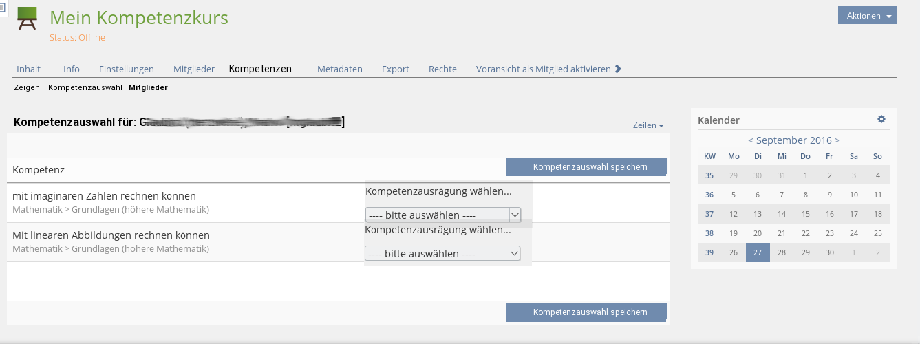 - Competences which have been assigned and publishedually should then be listed in the user's competence management (just like automatically assigned ones) or the "Show" screen of the course's competence tab.