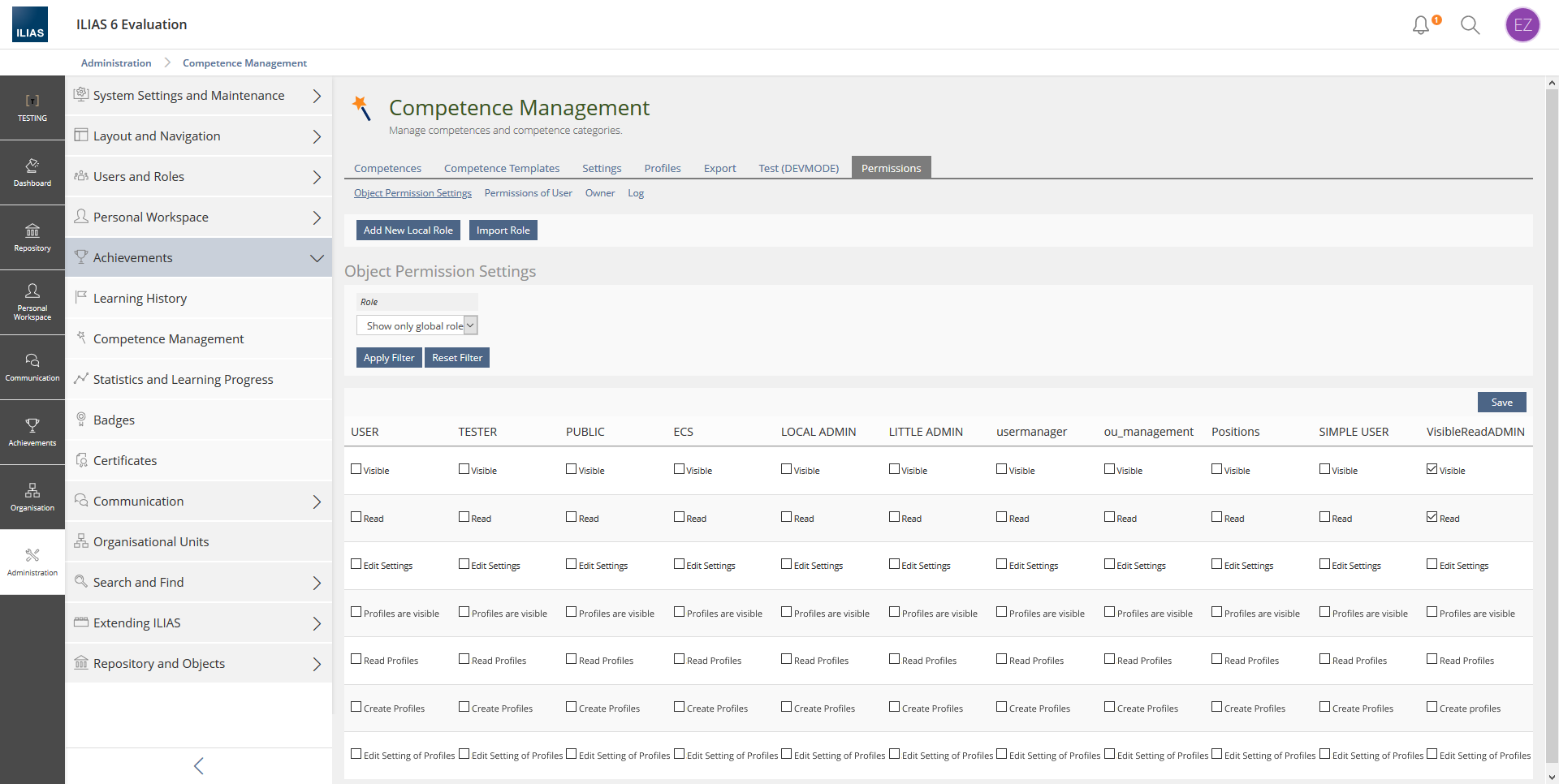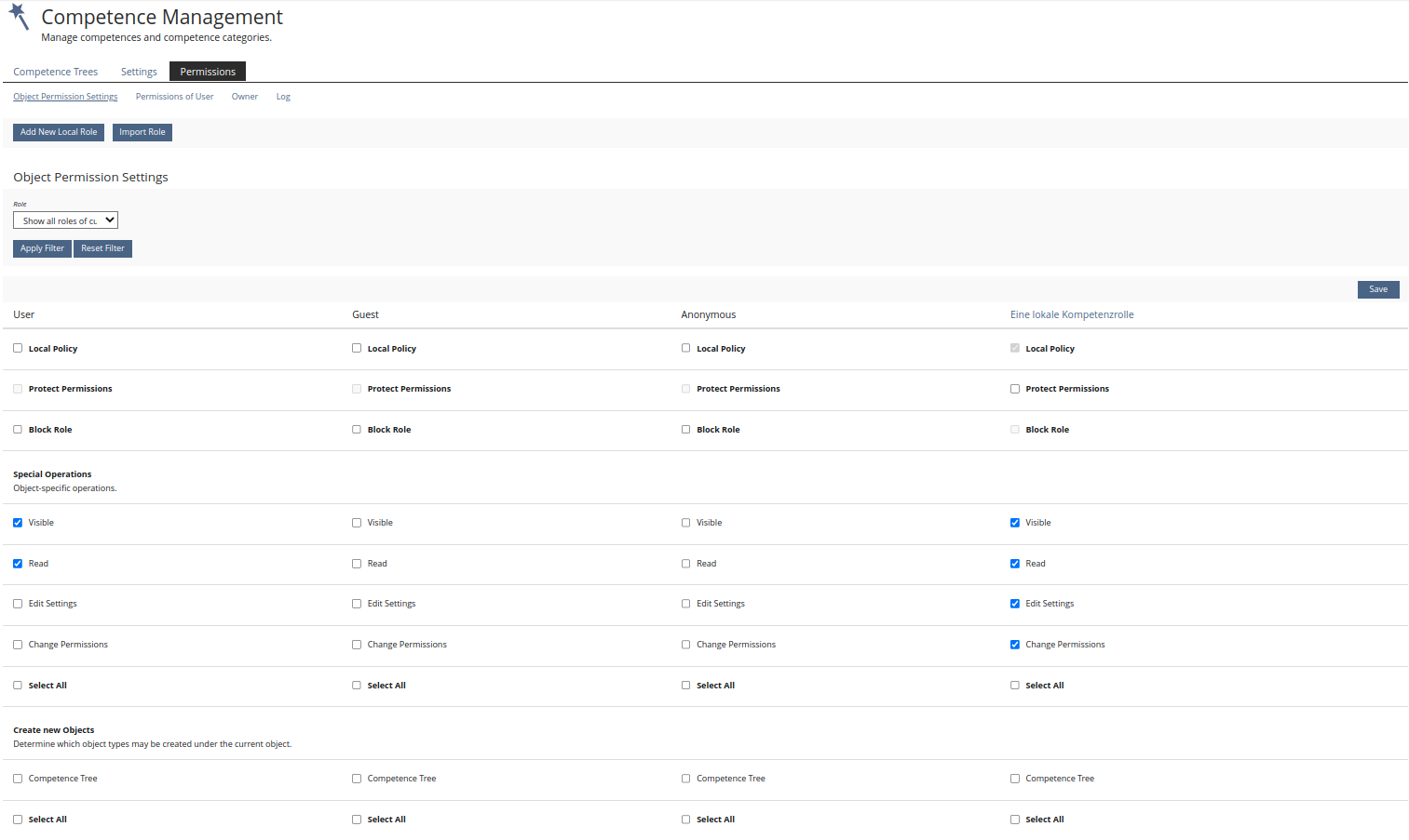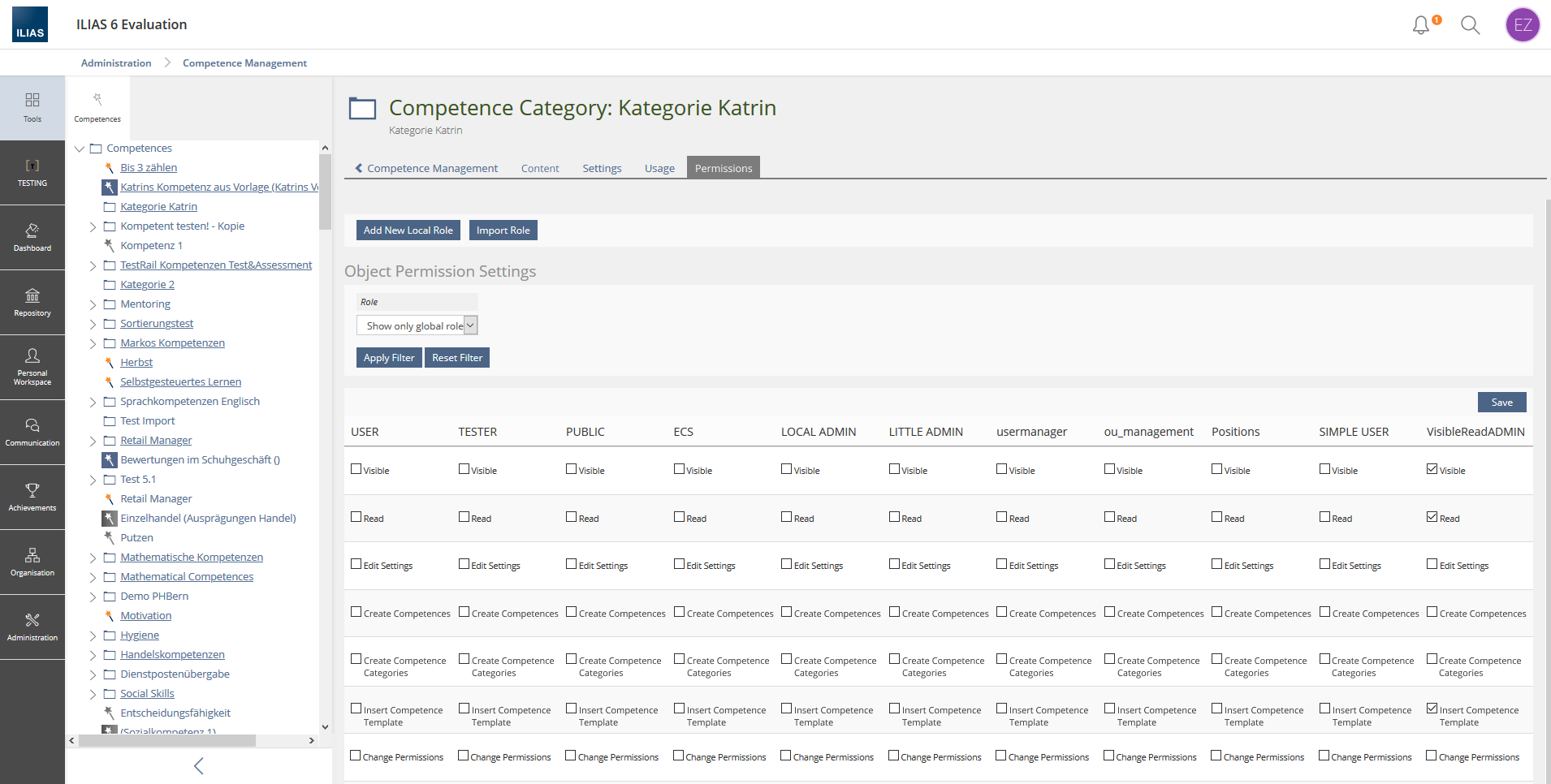 Competence categories get their own tab 'Permissions'. In the 'Permissions'-tab local roles can be created, roles can be imported, global roles can be assigned permissions. The Permissions are