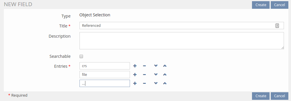 Klees, Richard [rklees] Discussion with Stefan Meyer: Use dropdowns for type selection, not text edits. Manual sorting won't be required, types should be sorted according to appearance in "New Item" menu. Selection in the Form should be according to the selection when creating course references. In the repo list, a standard goto link should be used. The field should only be shown in the repo item list if user has sufficient permissions the referenced object. The field should not be searchable.