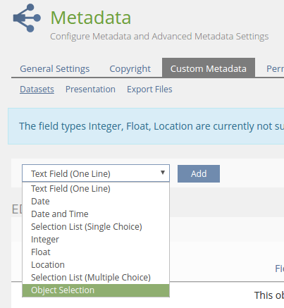 A new type OBJECT_SELECT should be added to ilAdvancedMDFieldDefinition.