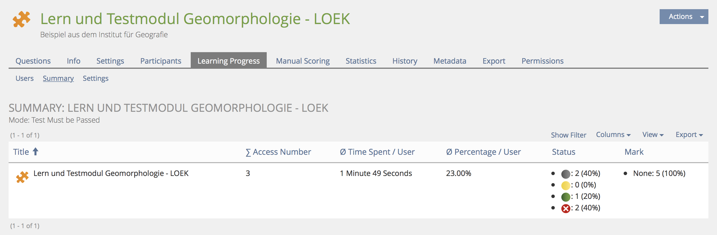 It has to be discussed, if it's a problem that course learning progress has a different title to learning progress in test (see "ø Percentage / User" vs. "ø Percentage / Participants" or "ø Percentage / Members).