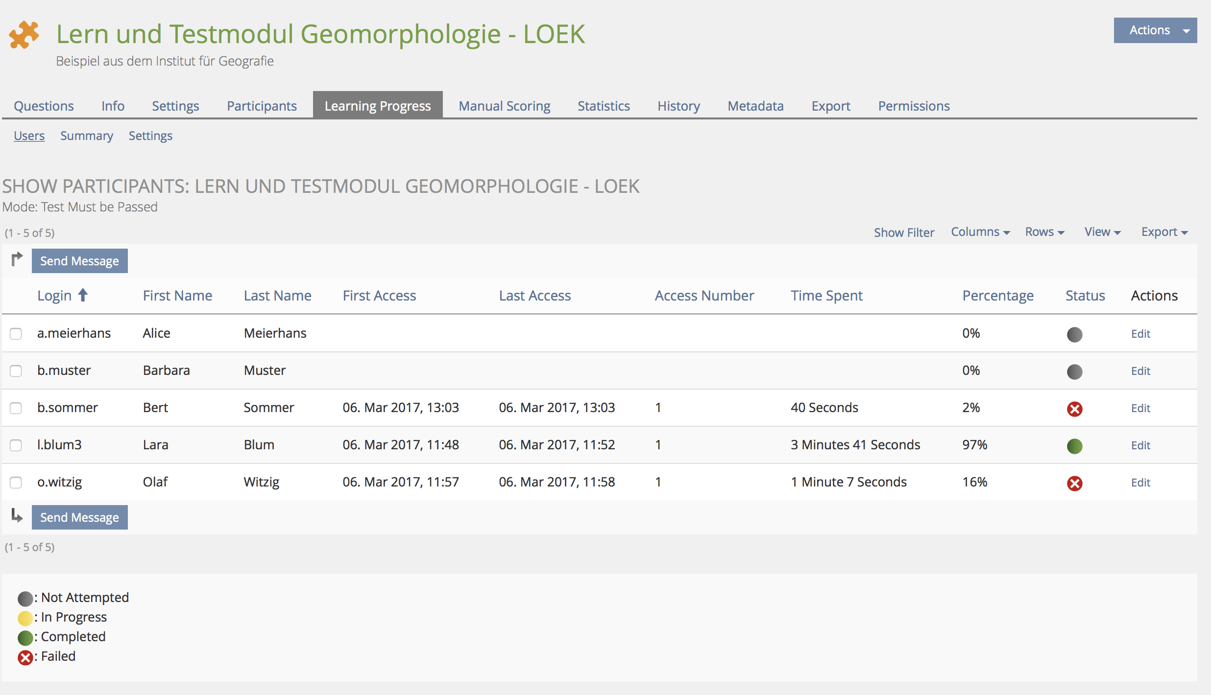 - a.meierhans and b.muster are course members, which didn't start the test.