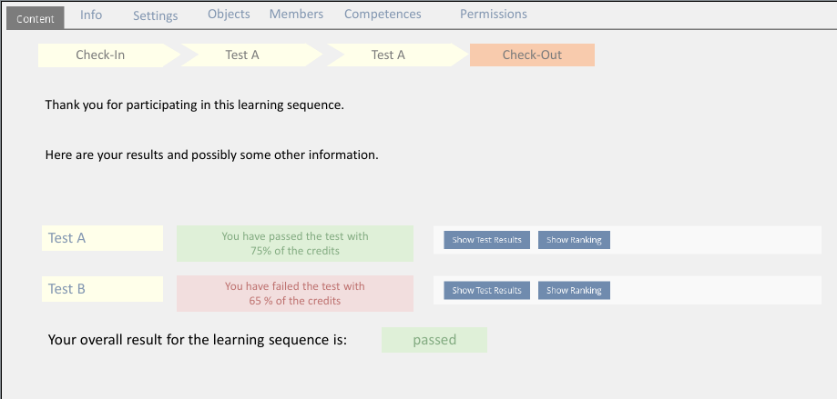 After finishing 'Test C', Anna is redirected to the check-out page of the sequence. There she gets an overview of her results from all three test. On entering the check-out page, her sequence status is automatically updated to "finished".