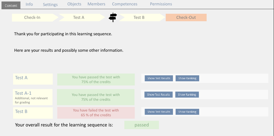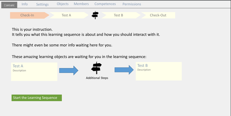Anna enters the sequence object an lands on the check-in page. She gets an overview of what is waiting for her: a nice looking overview consisting of tiles linked by arrows (with the objects icon, title and description) of the three tests and a button called [Start]. The course admin has a member panel that lists which users have begun the sequence and at which point every course member stands at the moment. They can easily see, that Anna has not started the OSPO yet.