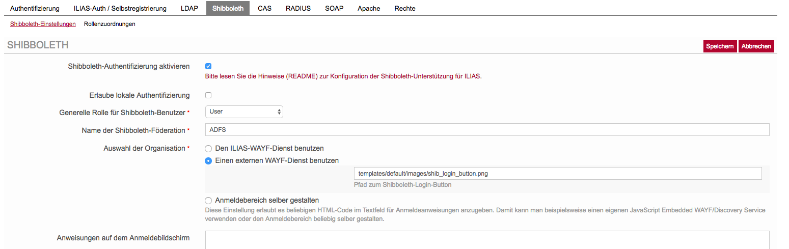 - Administration -> Authentifizierung/Neuanmeldung -> Tab "Shibboleth" -> Submenu "Shibboleth-Einstellungen"