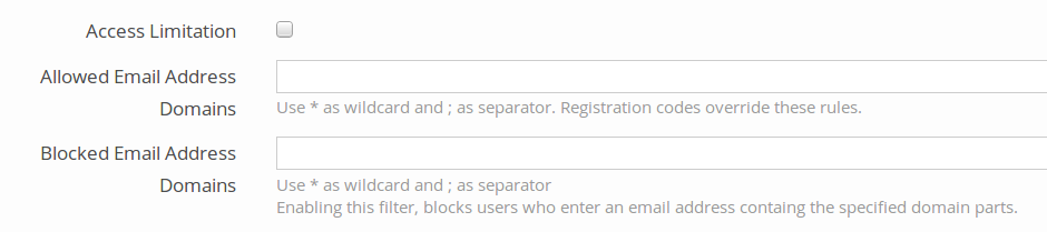 The registration settings in "Administration -> Authentication and Registration offer a new E-Mail Address Domain Filter: