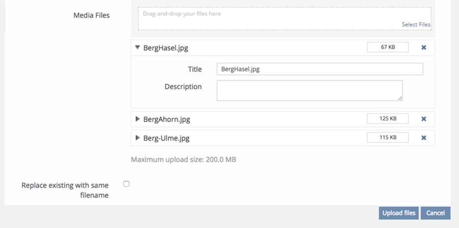 - Clicking "Upload files" will upload all files and create a media object for each single file.