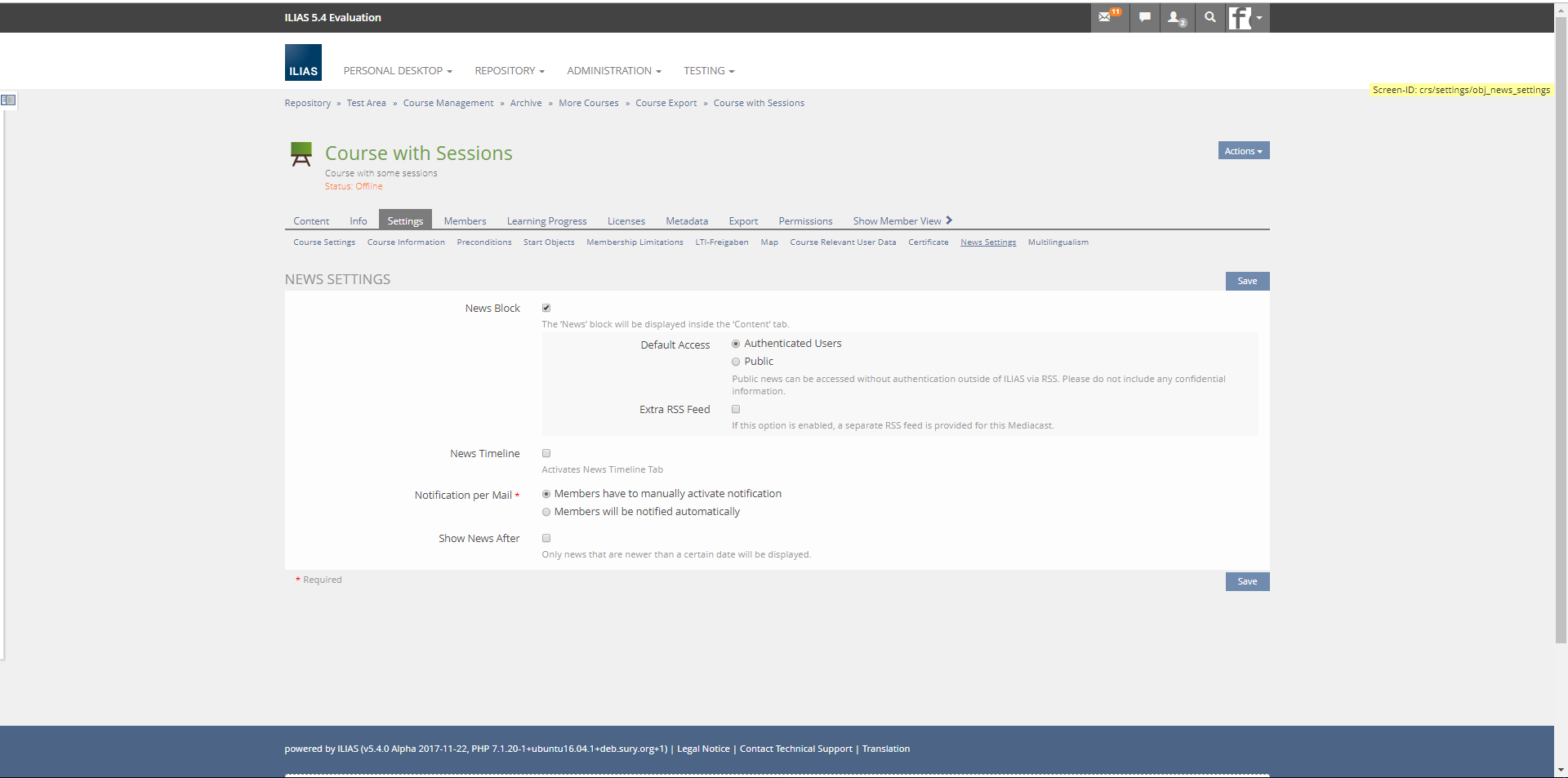 - Path: Course » Settings » News Settings