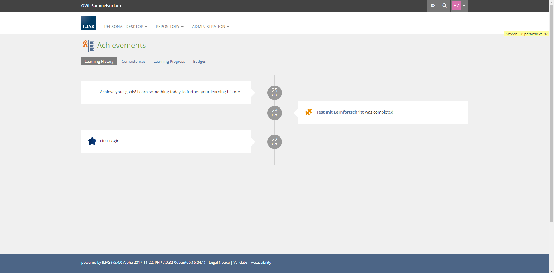 For this purpose, the elements "Competencies", "Learning Progress" and "Badges" should be summarized in a common main menu entry "Learning History".