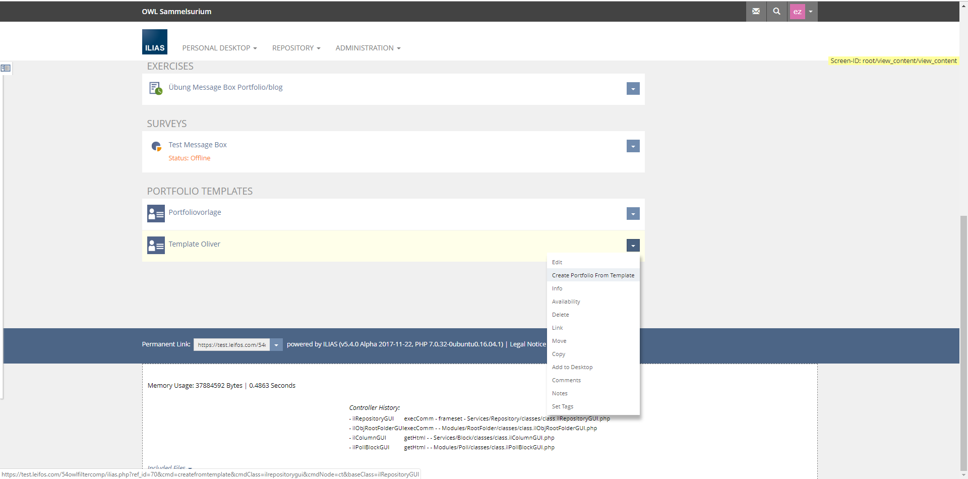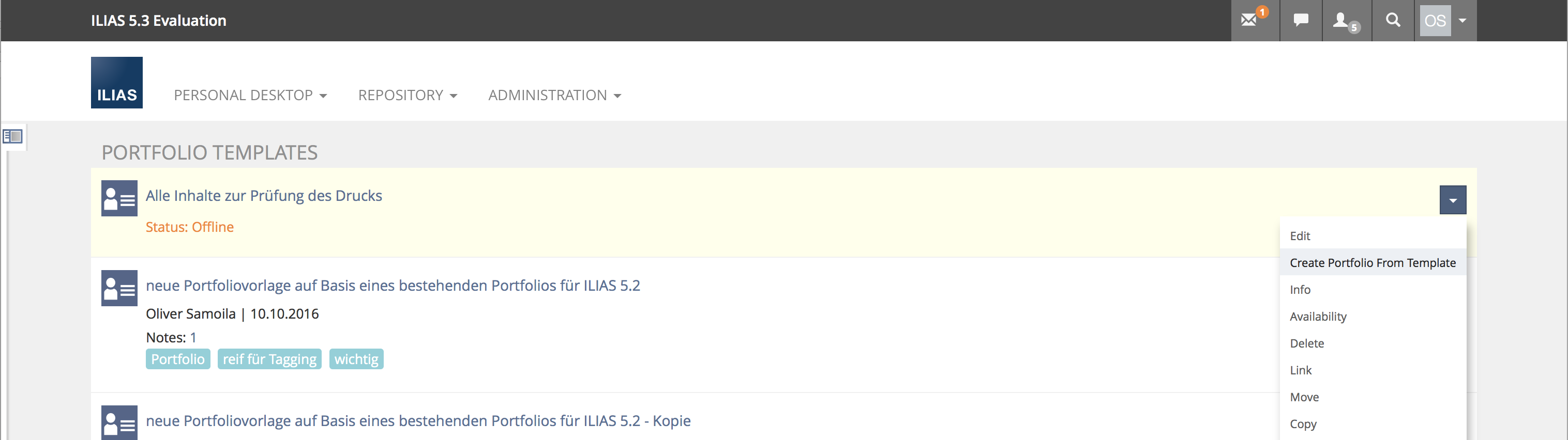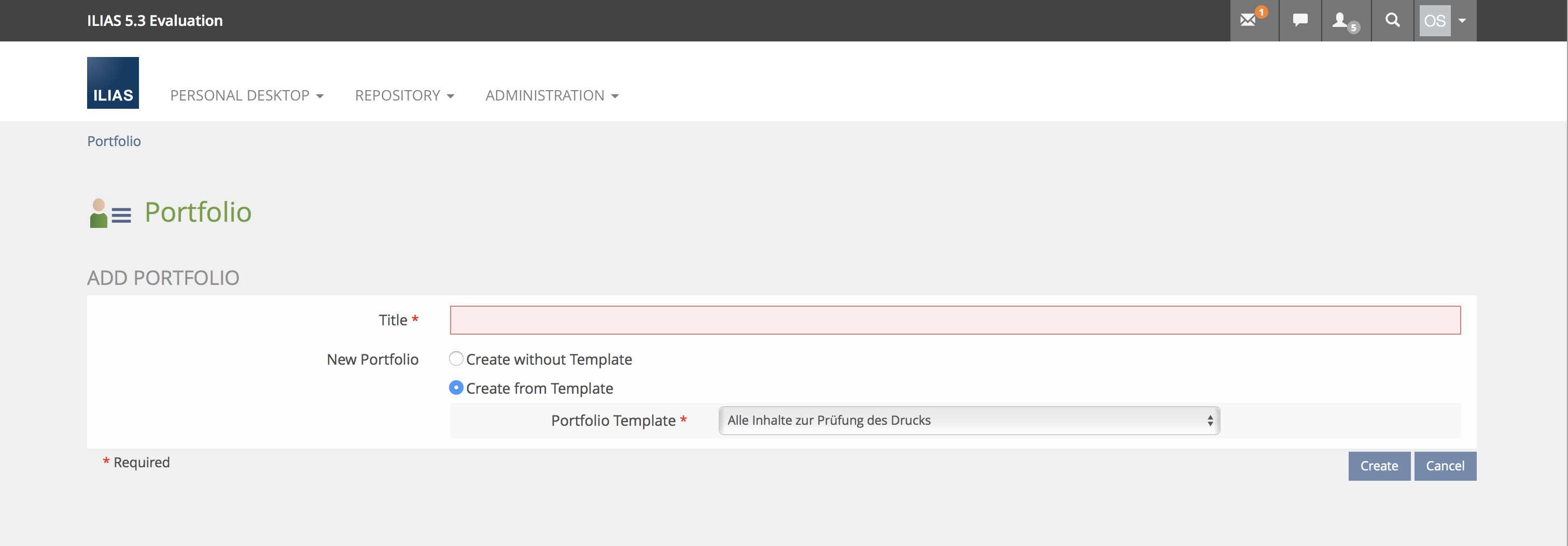 - ILIAS presents a list of Portfolio Templates and an option to create a portfolio without template. (That's confusing.)