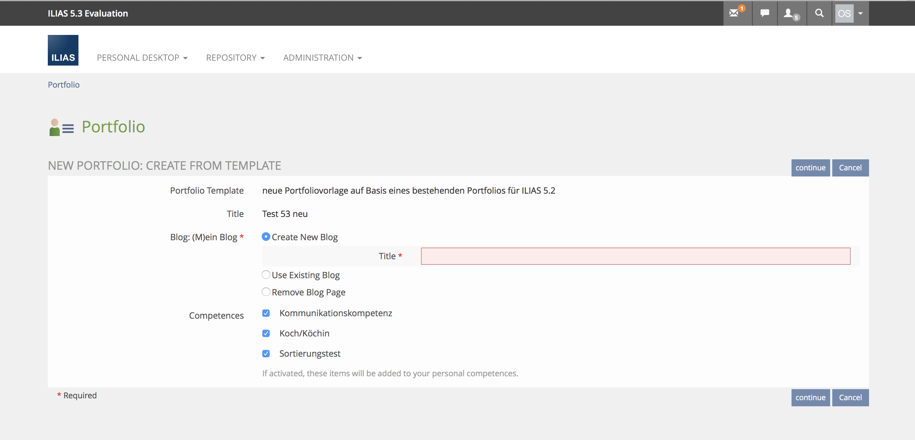 - ILIAS presents another form aksing to a) provide a title for the new Blog, b) Use existing Blog, c) remove Blog Page