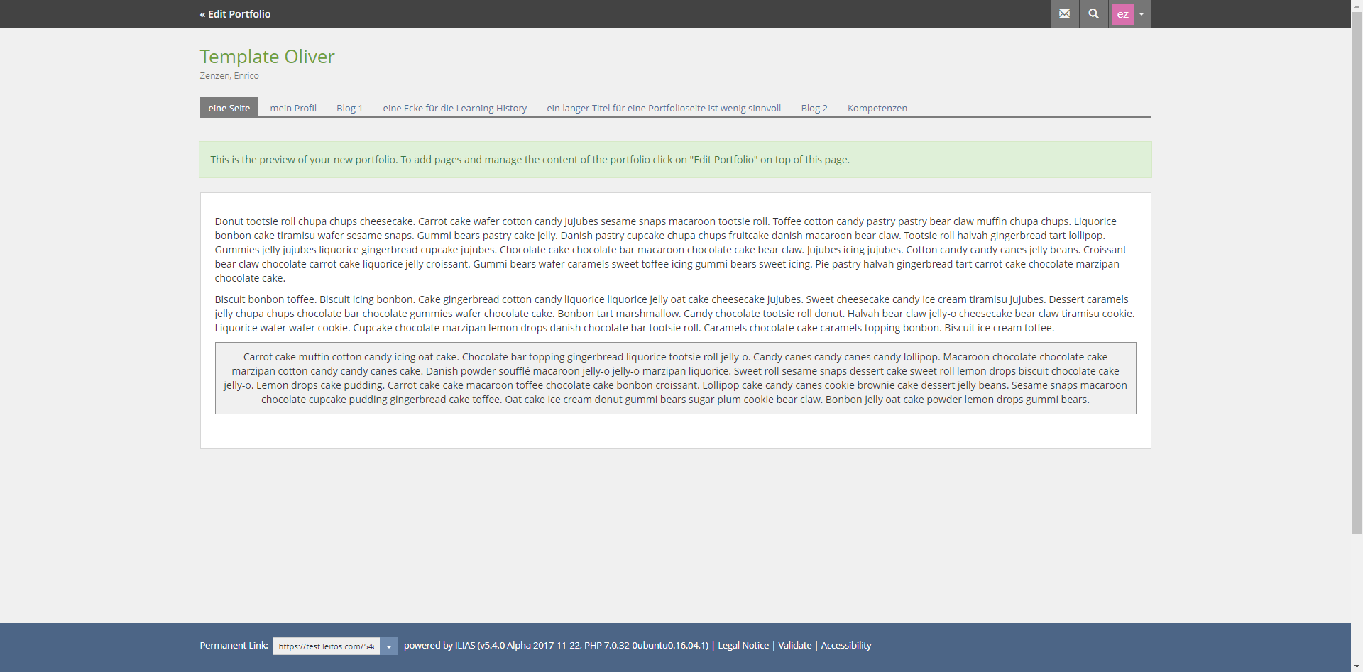 - ILIAS presents the Content-Tab of the Portfolio (custom titled in second Step)