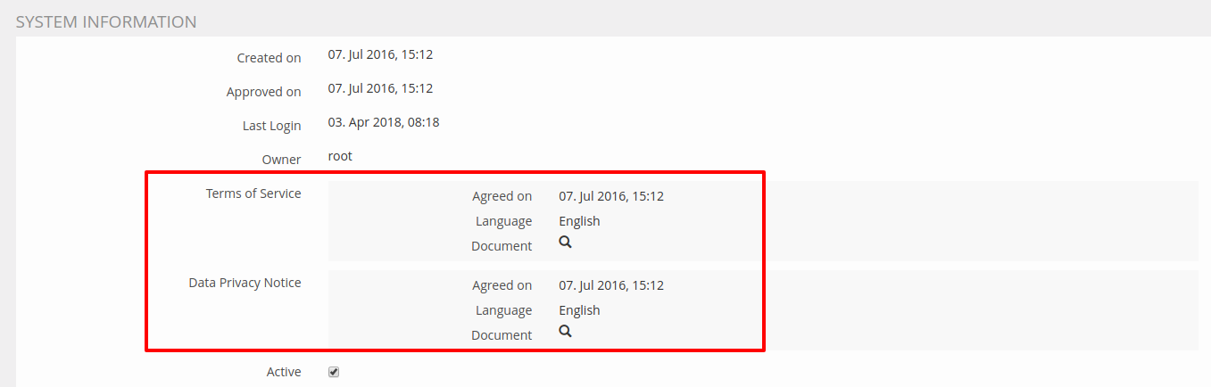 For administrators, the accepted 'Data Privacy Notice' should be visible in the respective user profile in the global user management.
