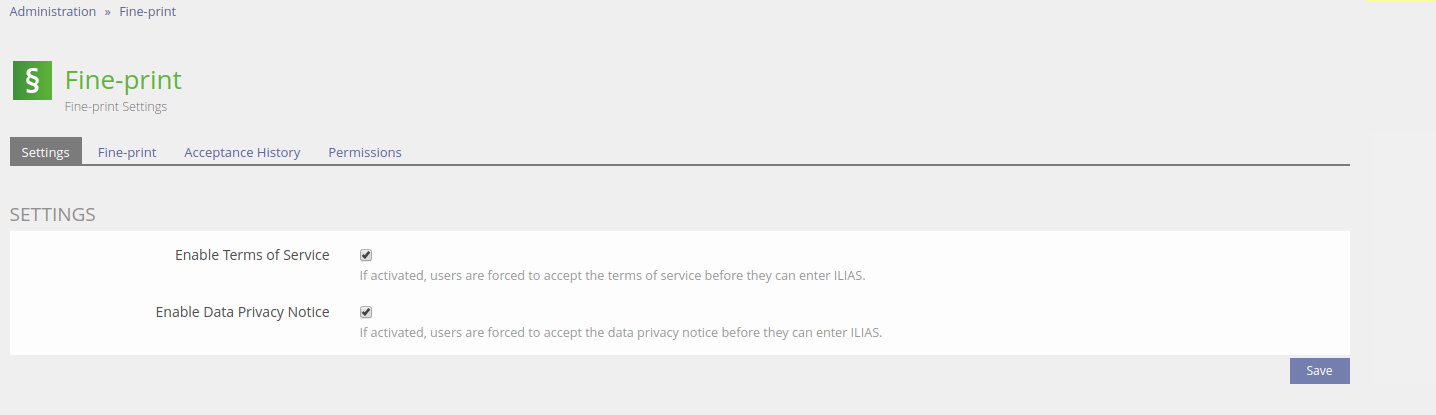 Currently administrators with file system access are able to deposit static HTML files (per language) as 'Terms of Service' (see: Terms of Services) documents which one must agree to abide in order to use ILIAS. The acceptance has to be done during registration or after login (if globally enabled).