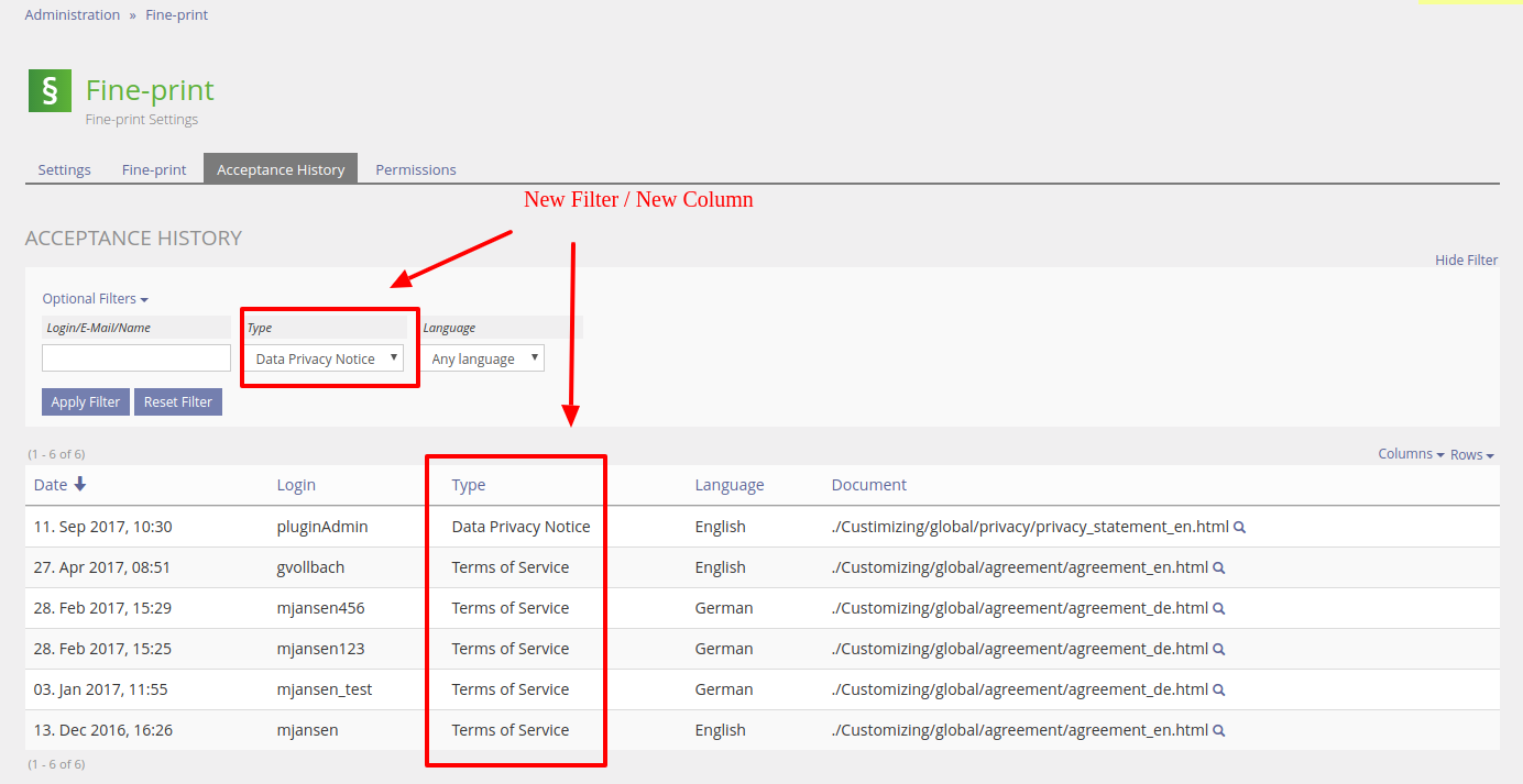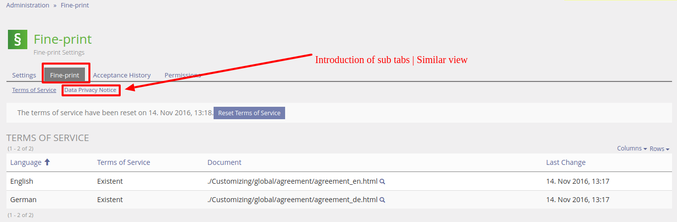Jansen, Michael [mjansen] 7 May, 2018: The determination of documents to be accepted will be always performend on login. You will be forced to accept a document if one could be determined for your current language. If there is only a regular 'ToS' document, but no 'Data Privacy Notice' document, then you just have to accept the first one.