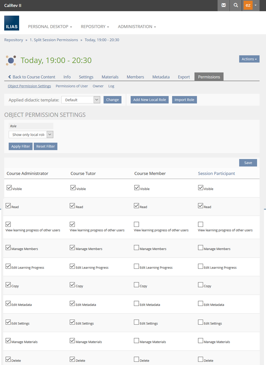 - "Edit Materials" as a permission could only be an "Assign Materials" permission which allows to assign existing course or group content to a session. The presentation of the "Add New Item" has to depend from the content creation permission of the parent container (course, group, folder) because sessions are no containers. So do we really need to support this permission? Or could it be part of the "Edit Settings" permission?