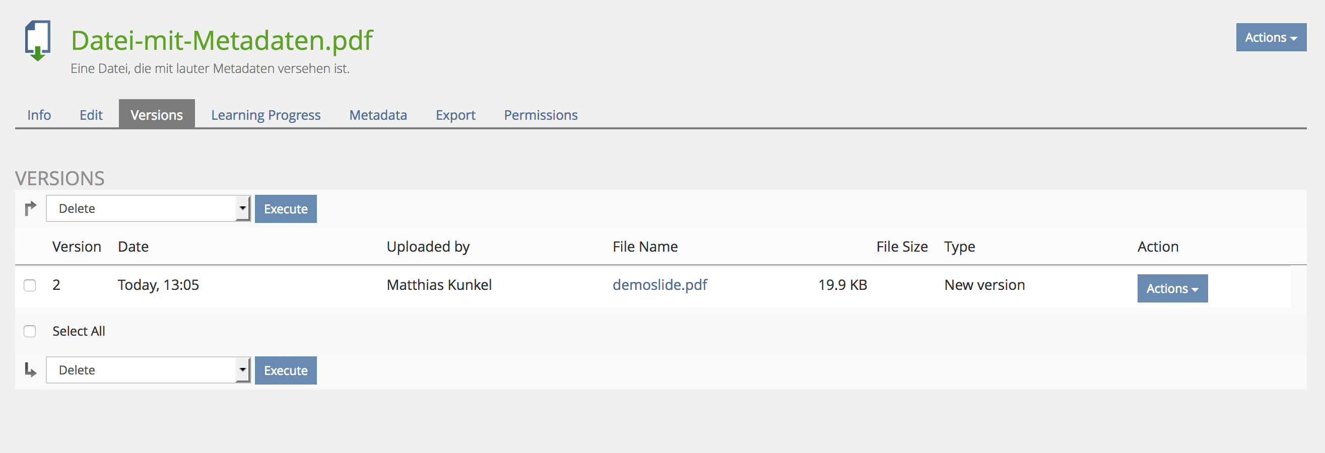 The file object already supports versioning of files. One file object can contain several versions of a file. A new version of a file can be uploaded in an existing file object without getting a new permalink or reset permissions - which is a very helpful feature. Authors have the option to keep existing files which are still available for download on the 'Versions' tab, for example to show the change of a certain document. Or they can delete old ones and only publish the latest version of a document.