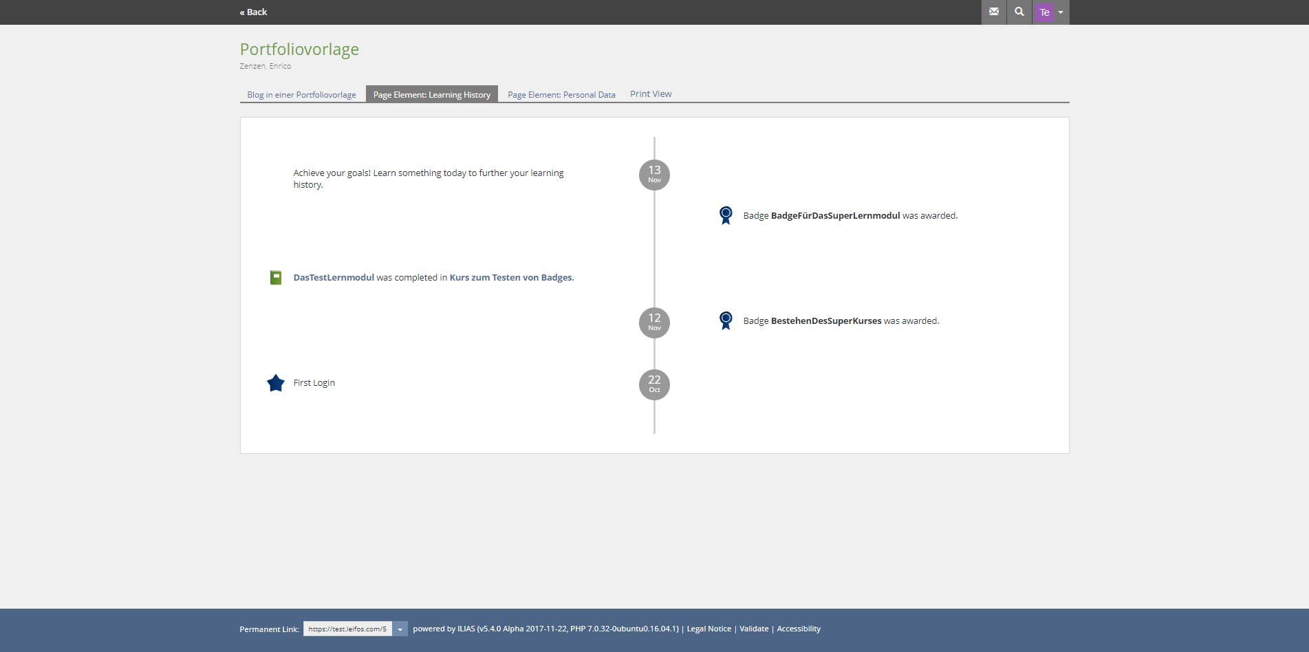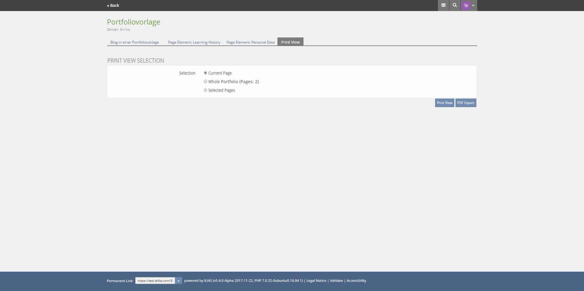 - Anmerkung EZ: Soll das tatsächlich so sein? Nach ILIAS Logik folgt auf die Print View die Ansicht Print View Selection. Soll diese übernommen werden, um den Vorgang einheitlich zu gestalten?