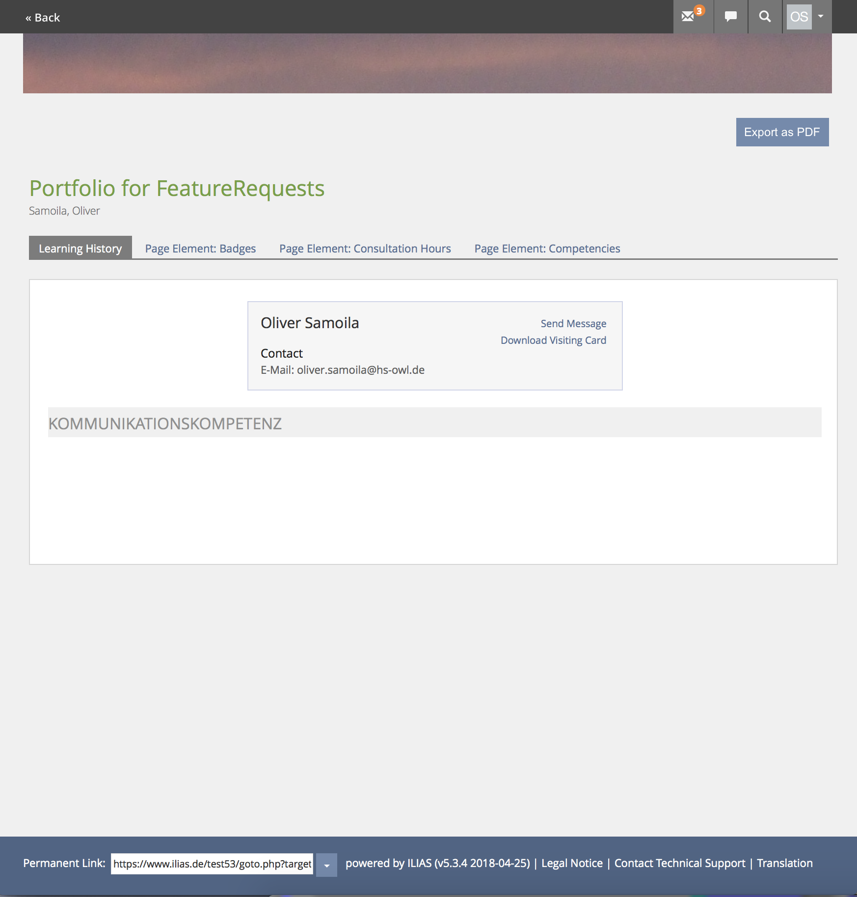 - Anmerkung OS: Wir wollen einen PDF-Export, keine Druckansicht. Druckansichten wie im Wiki, Lernmodul liefern andere Screens/Ergebnisse als PDF-Exporte bspw. im Test. Ich behaupte mal, das die eigentliche Mischkonstruktion der jetzige PDF-Export des Portfolios als Besitzer ist. Das ist aber auch gut, da es sich mehr an den Anforderungen als an Bestand (mit anderen Zielen) orientiert.