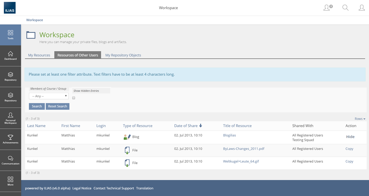 Portfolios, blogs and files can be shared with other users. A classic use case: a learner shares a resource to a teacher.