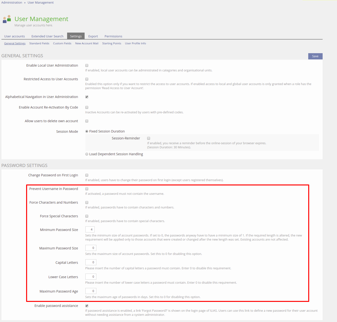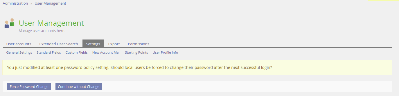 - Force Password Change: If clicked, all local ILIAS user accounts should be forced to change their password after their next successful login. The 'General Settings' page is shown afterwards with a respective MessageBox.