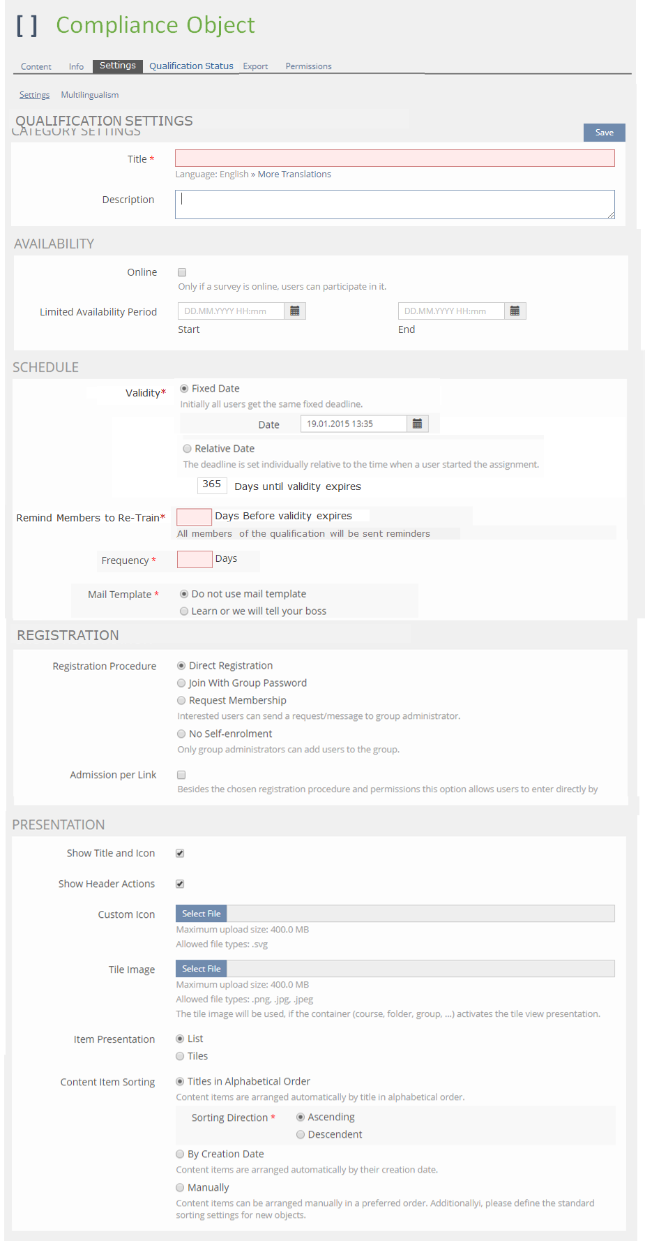 The Compliance object can be added in the Repository. Adding has the typical create-dialogue with new, import, copy.