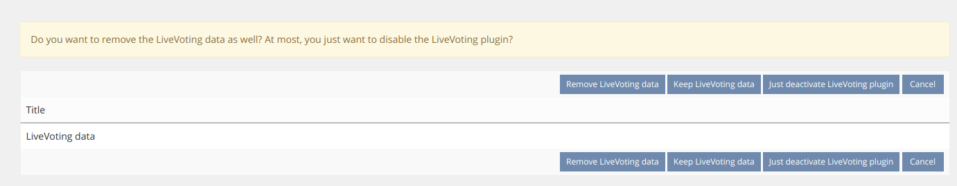 - If you uninstall an ILIAS plugin and it implements the uninstall, the plugin data will be removed always. The user should be informed about this process and should confirm, that he want to do this or not. So the user doesn't delete accidently important data and he can later use the data again, if he install the plugin again. So ILIAS plugins developer are no longer in dilemma to implement the plugin uninstaller