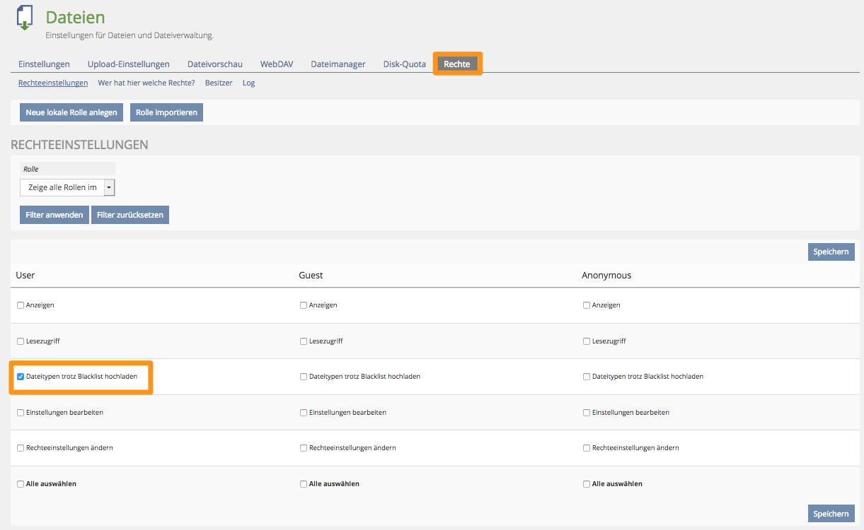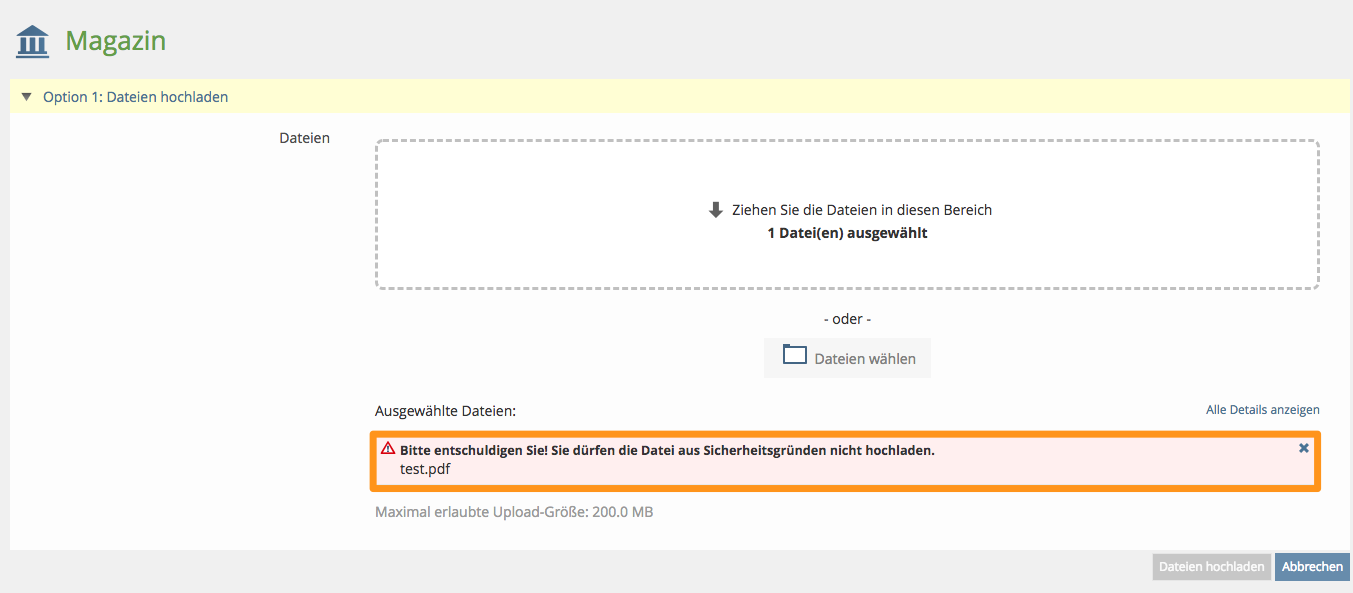 The right does not belong to individual objects but is assigned globally via Administration » File. Files in .zip format should be checked as well. The upload is canceled, if the .zip file contains a blacklisted file extension, but there is no renaming of .zip-files.