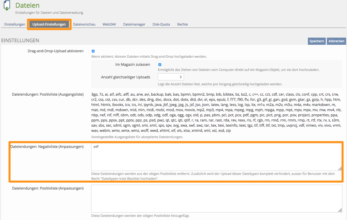 - The blacklist should become a own input. Current negative list of whitelist should be kept because files with this file ending still can be uploaded but are renamed while blacklisted files are really blocked from being uploaded.