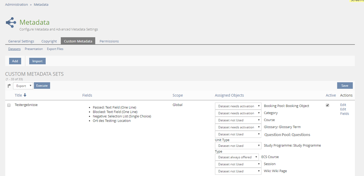 - Global Custom Metadata can be created in the the Metadata section of the global Administration and and Questions Pools show under "Assigned Objects".