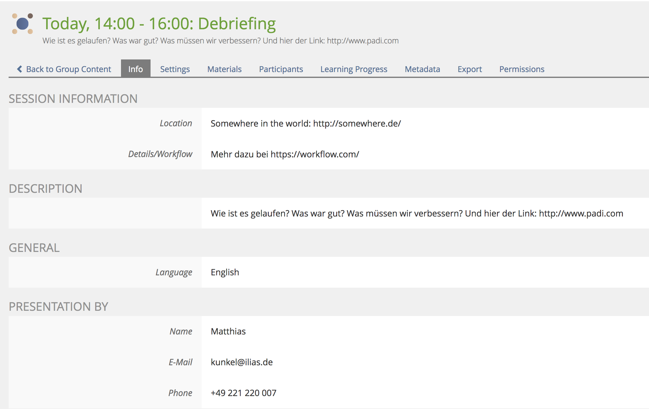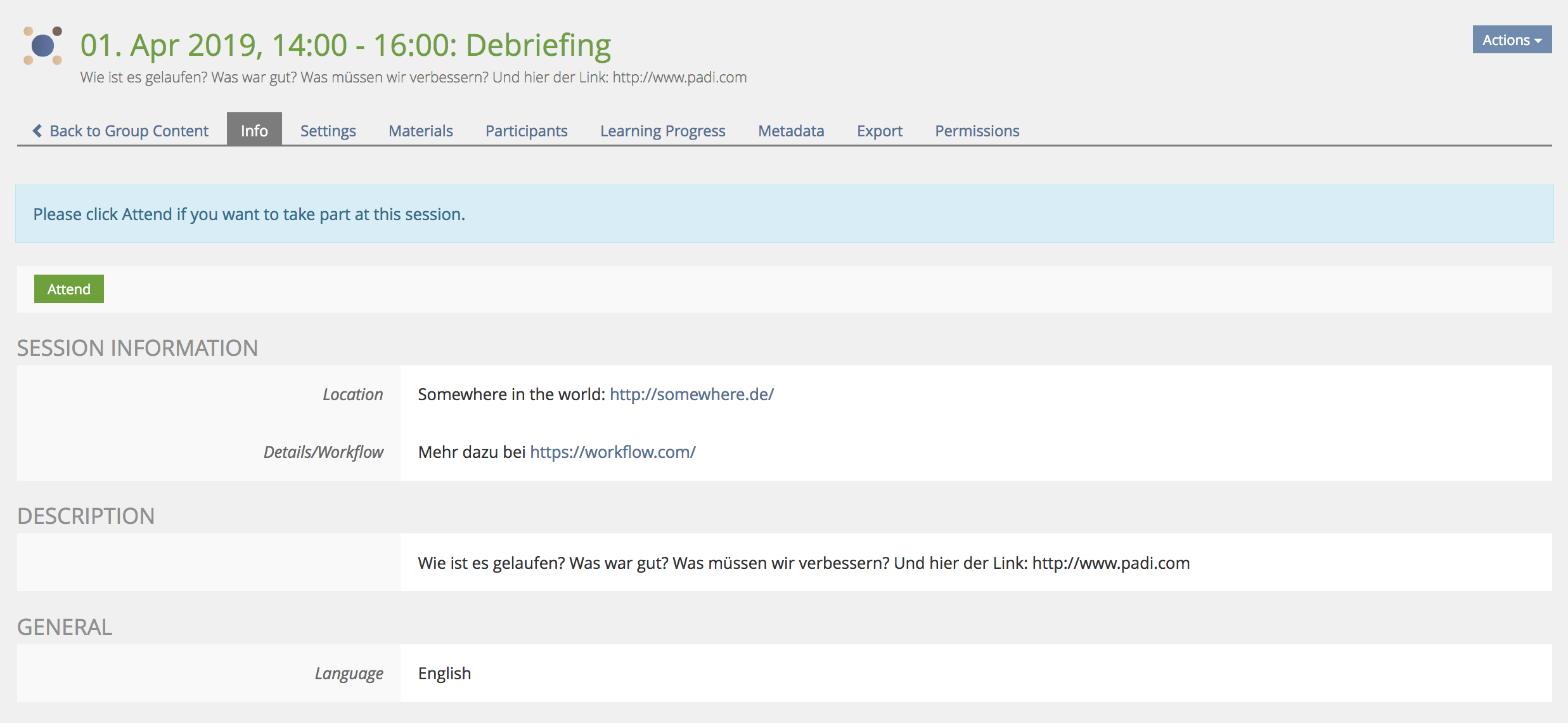 Especially for sessions there is a need to communicate information about related web pages, e.g. a journey description or a location description. But entered URLs are only displayed as plain text and need to be copied from the info page of the session and then added to the browser's address bar manually. Even the input field for the e-mail of the presenter is not supporting clickable URLs, see screenshot.