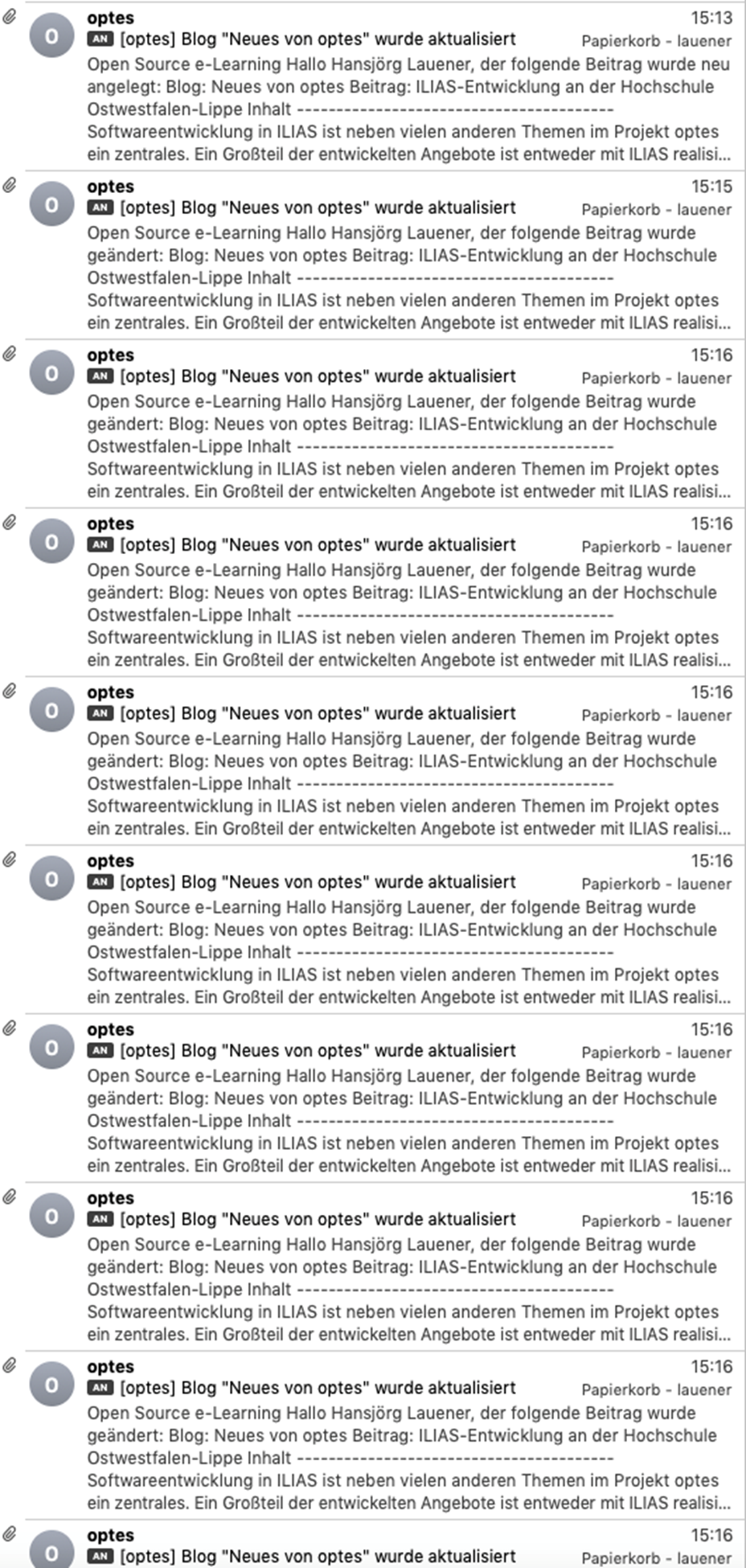 - Idea: As long as one user is working on a page (and the page is blocked for others), no notification is sent. Once the user unblocks the page (by clicking on the dedicated button to leave the Edit mode) or the blocking period ends automatically due to inactivity, ILIAS sends a notification. This would even allow to send more specific notifications. A first one could be sent when a user starts to edit a page (by changing to the edit mode). A second one could be sent if the editing mode has been left (manually or due to inactivity).