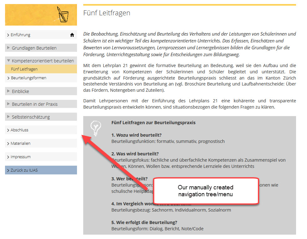 At the PH Zürich we produce a large number of learning modules. More and more these modules are open educational ressources. While we can customize the content with stylesheets to give it a pleasant and modern look and feel, the navigation-tree cannot be customized and looks old fashioned and does not meet our graphic standards.