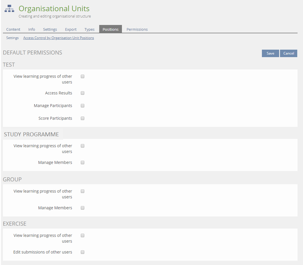 The tab "Permissions" will get a new standard subtab "Orgunit-specific permissions". The settings of Org-Units will get a new standard entry "Positions in Study Programmes".
