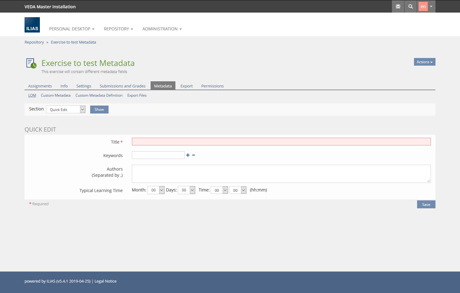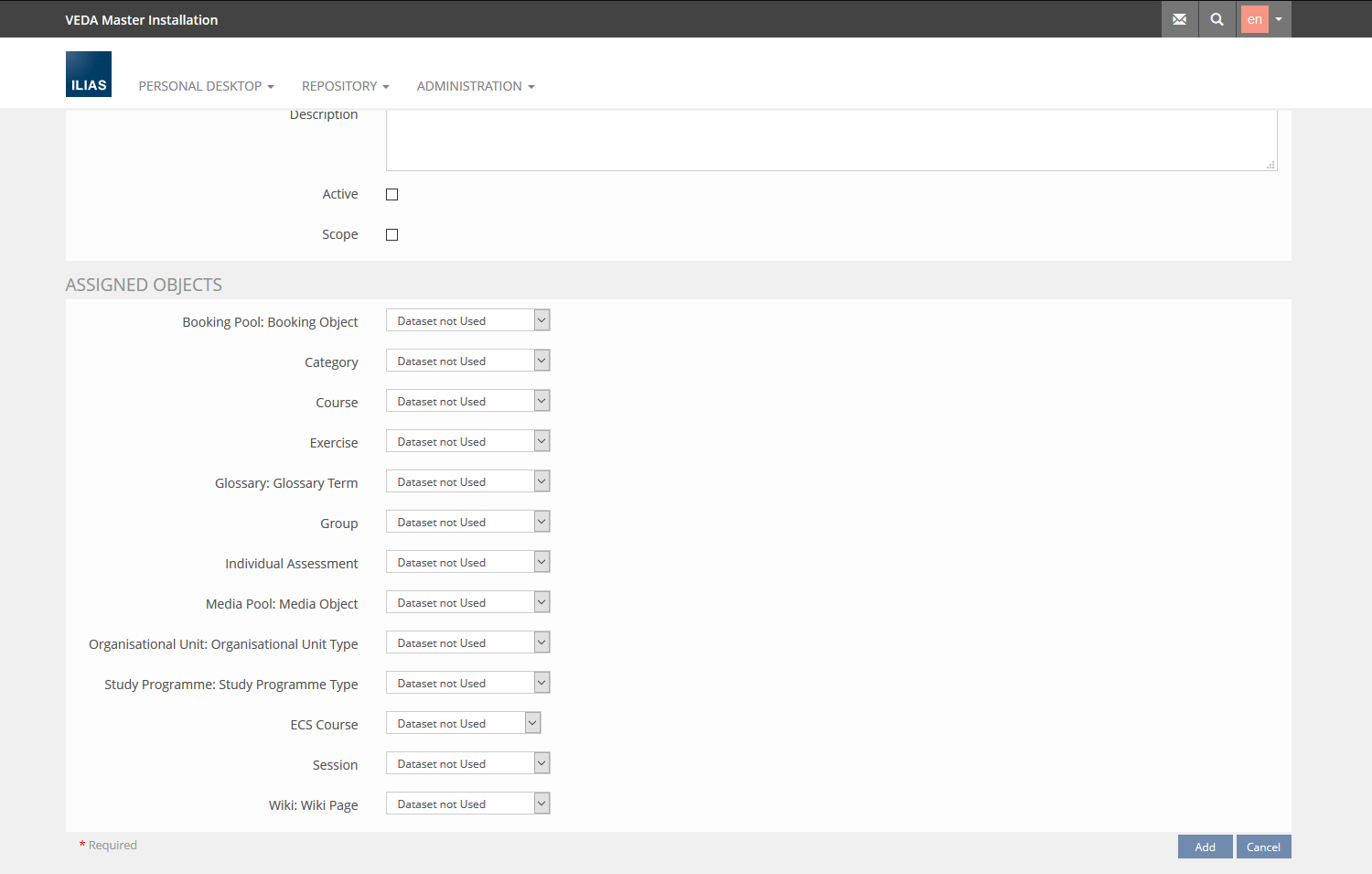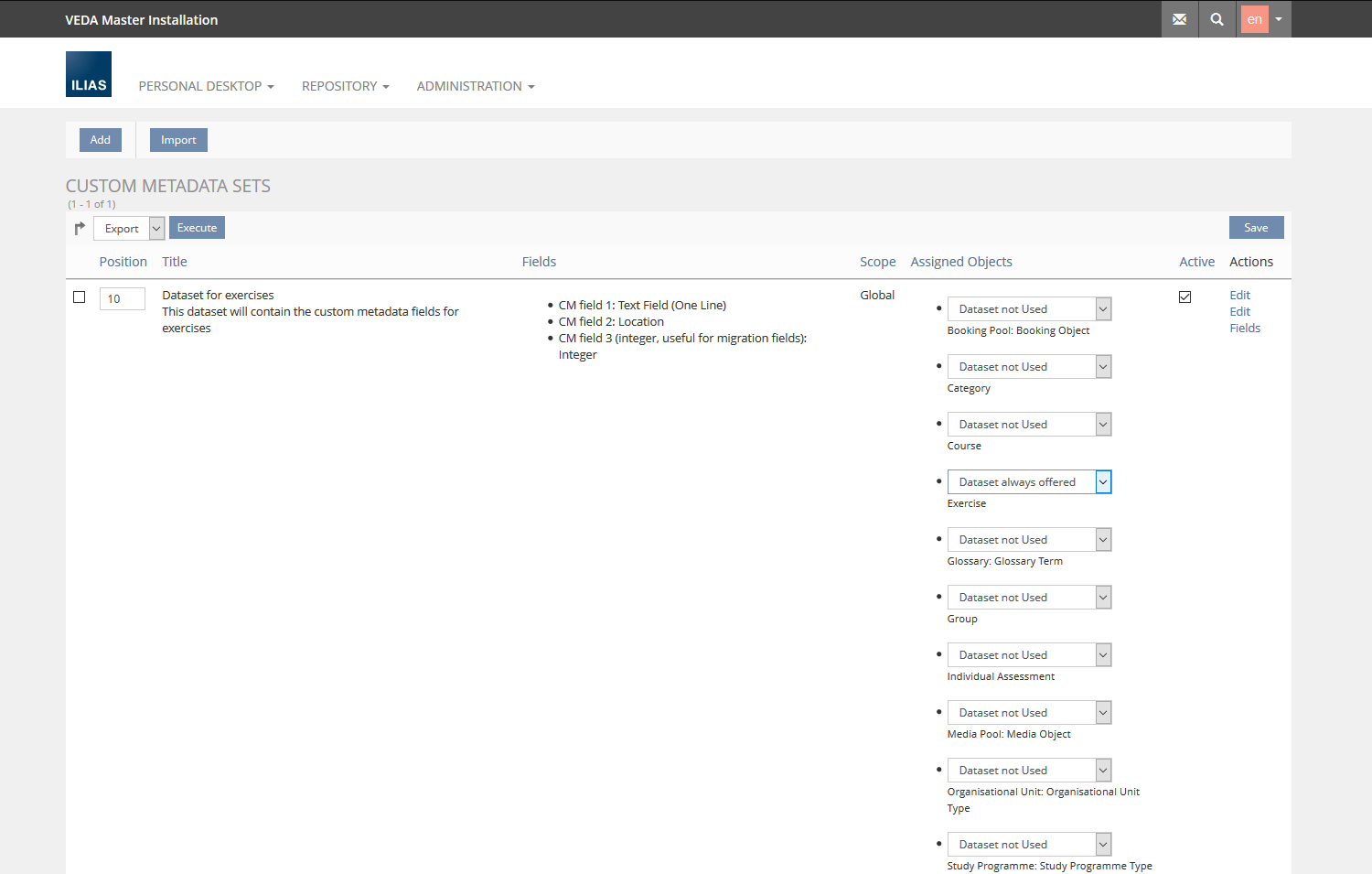 - ILIAS Administration >> Metadata >> Custom Metadata >> Datasets