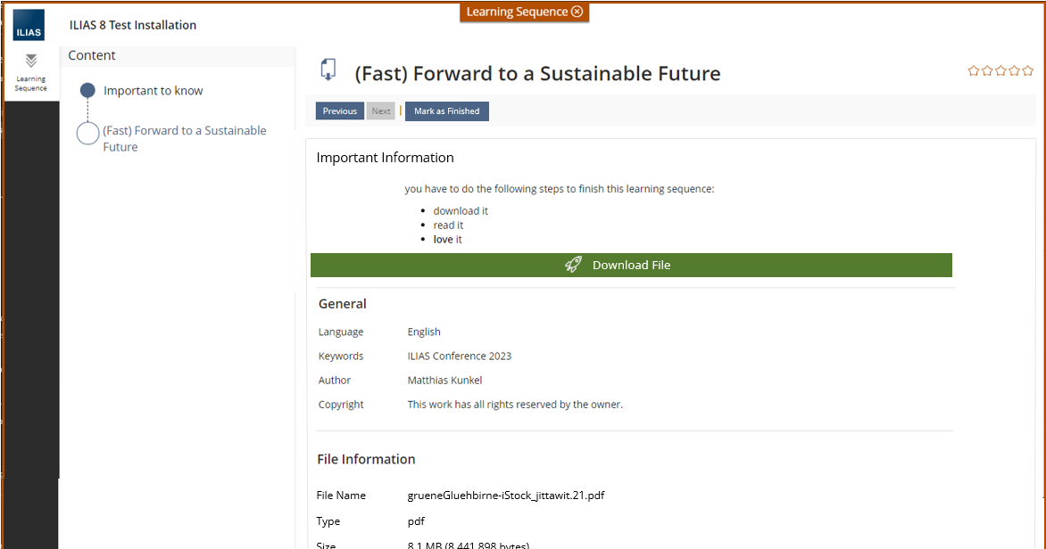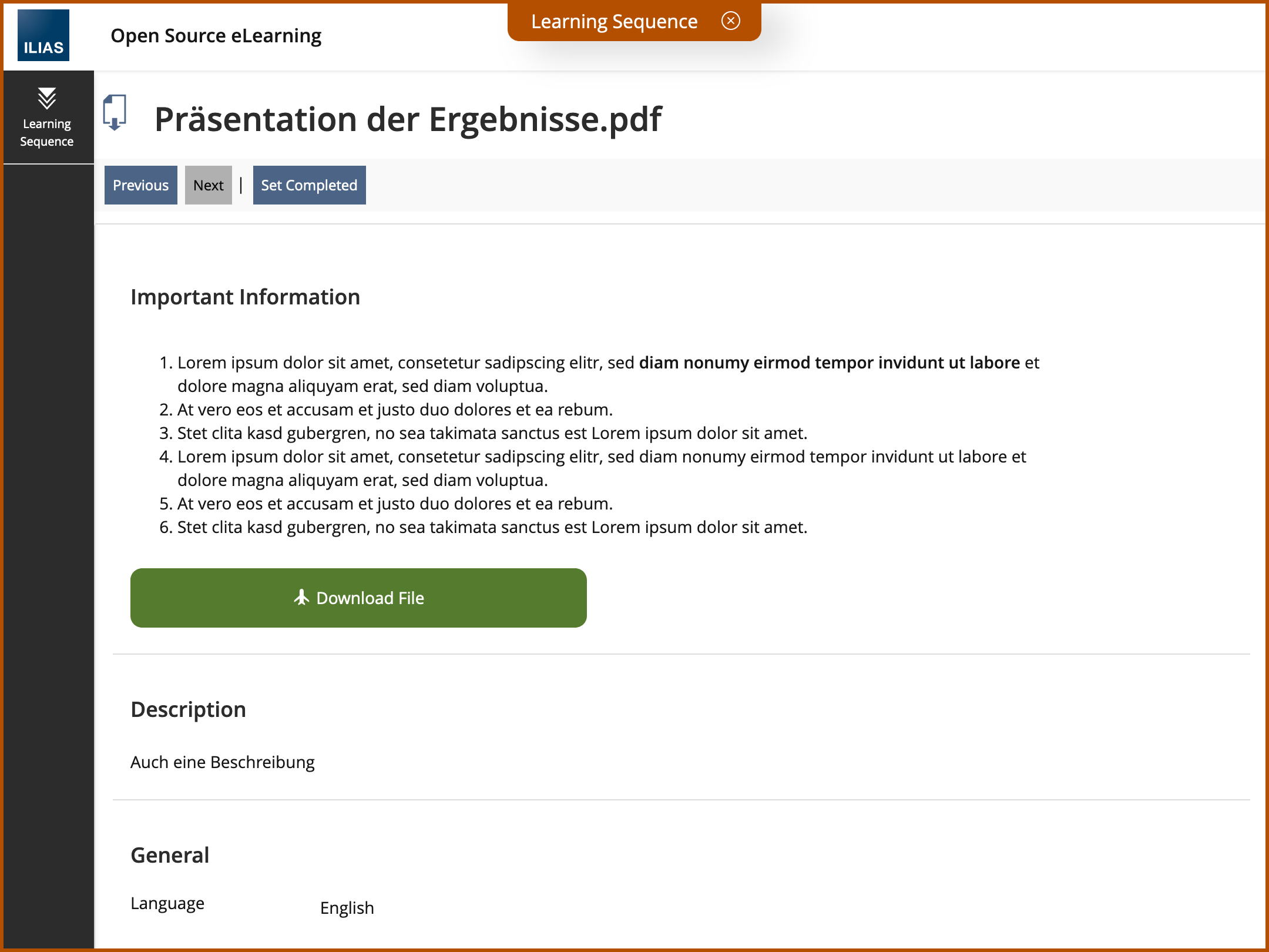 - If in the LSO the setting „user may proceed“ is set to "learning progress", the „next“ button is clickable after using the download button OR after the user has marked the file as finished