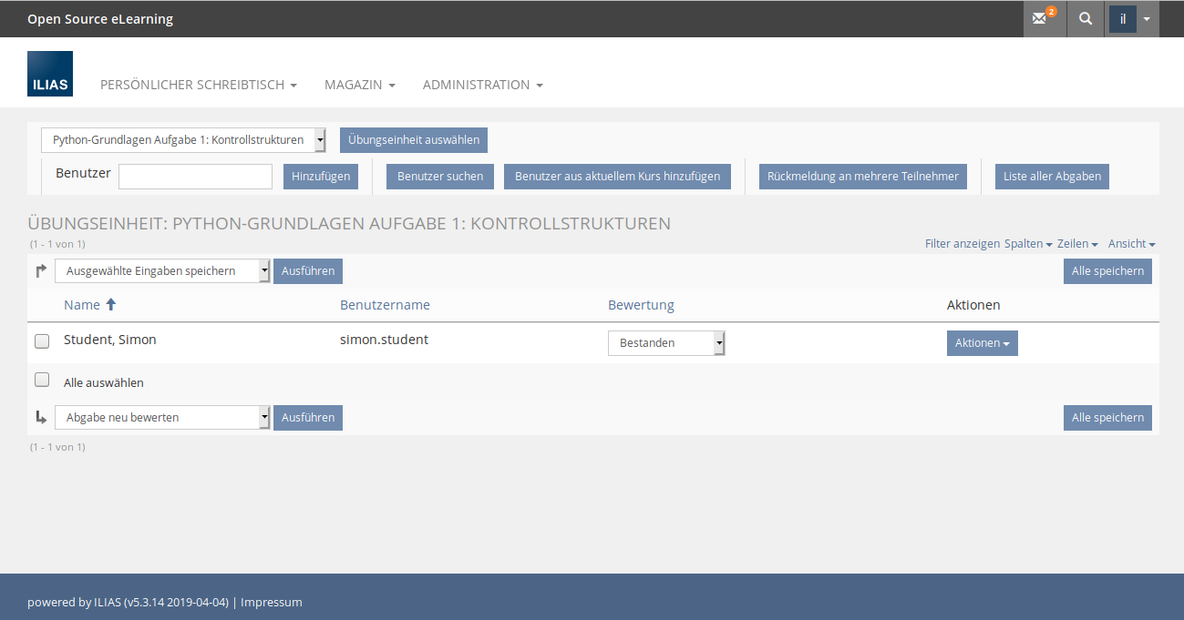 The teacher can view the results of the automated review under 'Submissions and grades', using the existing fields of ILIAS, as a mandatory field 'passed/not passed' and optionally submit a grade and text for the feedback field. If the teacher needs a new automated evaluation of one or more submissions, she can trigger this by clicking on 'Re-evaluate submission' in the action menu. (see Abb. 4)