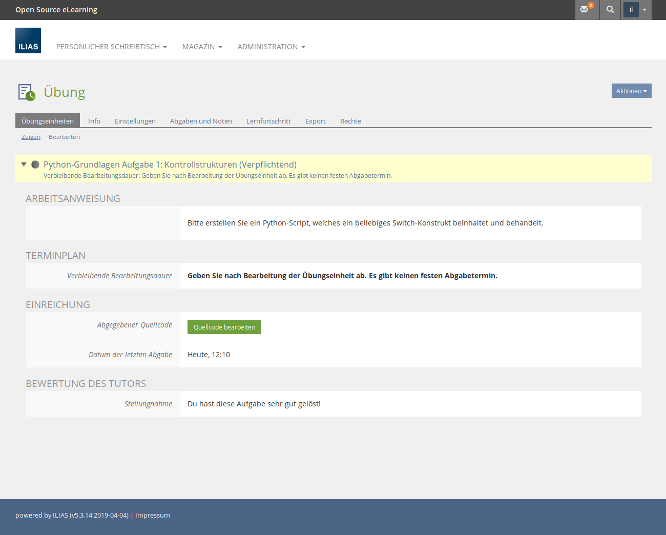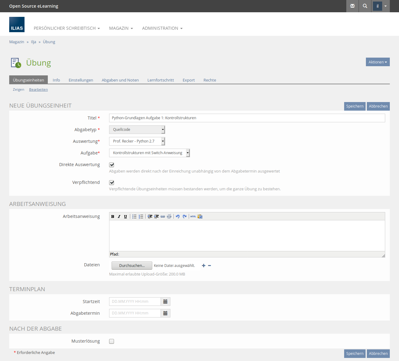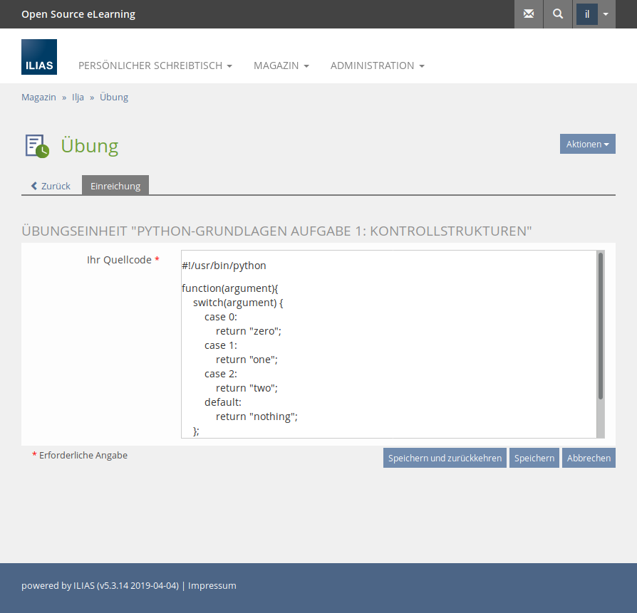 Teacher Stefanie teaches script programming at the FH Dortmund. She wants to offer her students the opportunity to practice for the exam on their own. She creates a new assignment of the type "Source Code" in the exercise object, selects the programming language "Python" and then the task "control structures".