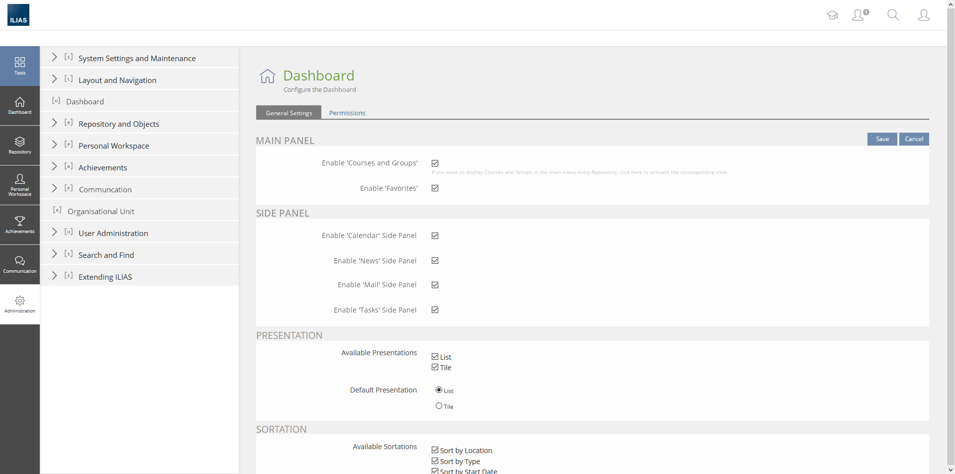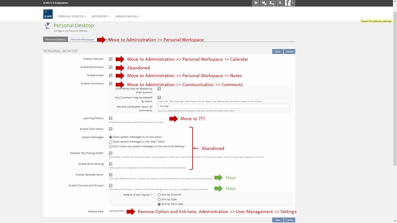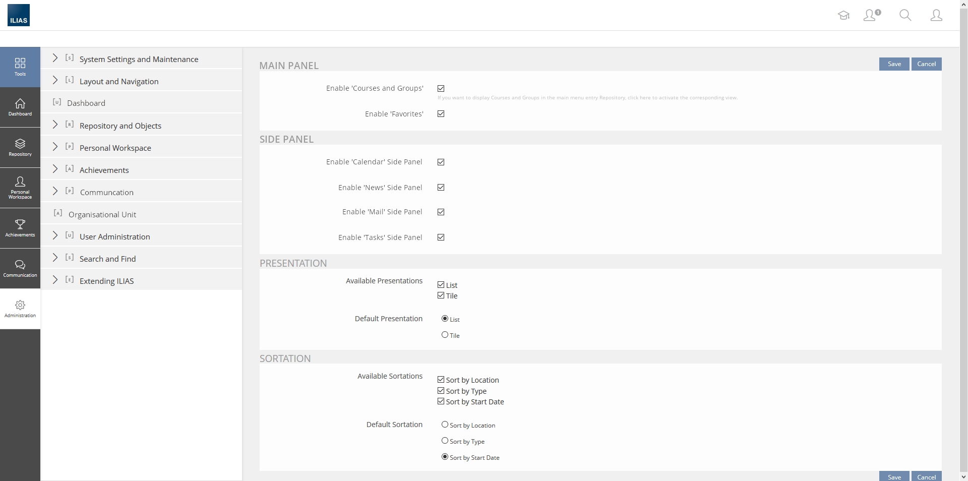 - We highly appreciate the additional administration pages for the administration menu entries. Please add the new entries to Default Configuration of Main Bar Items (ILIAS 6).